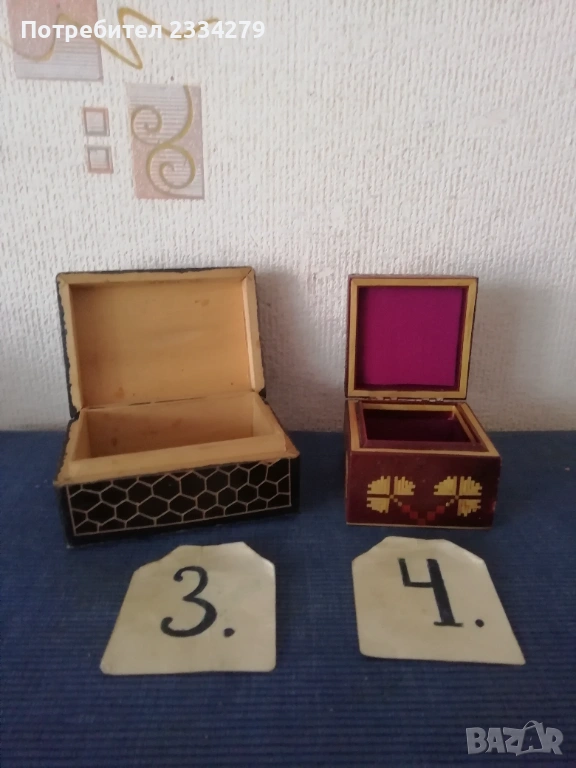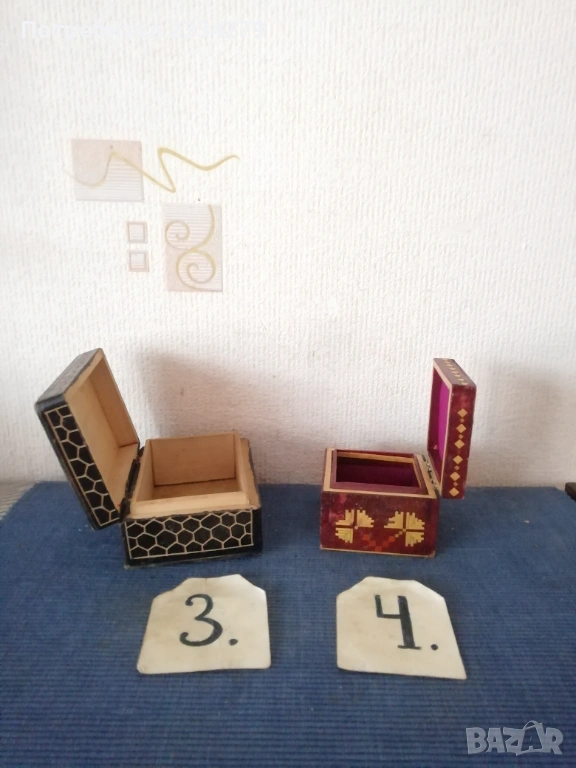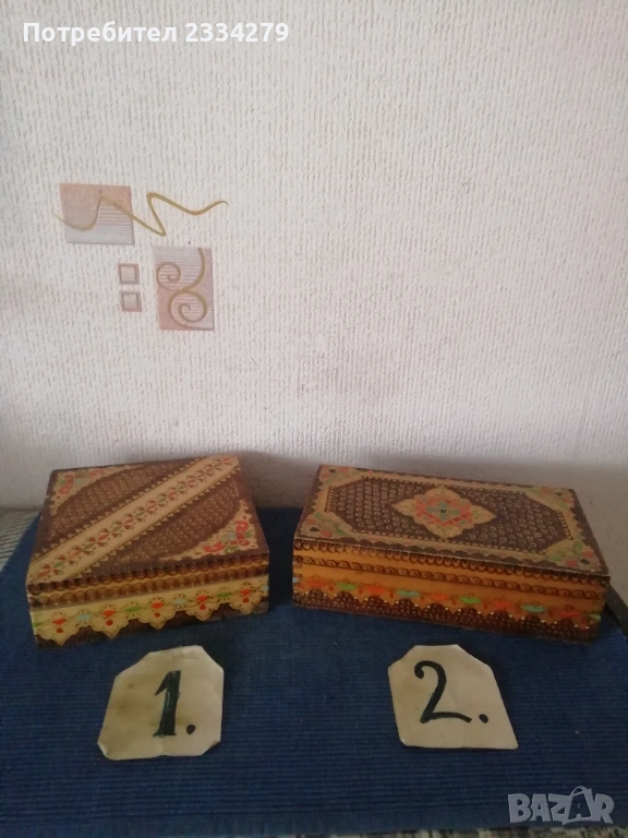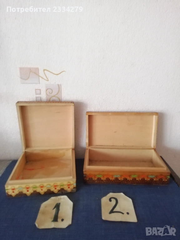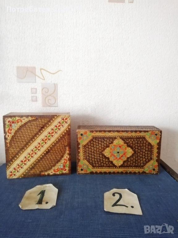 Стари дървени предмети. N:1,2 стари дървени кутии от 70години, ръчно изработени перография и рисувани много добро състояние, размери 17х17см.,цена 5€., правоъгълната 23х13, цена 5€. N:3,4 стари кутии от 40-те години, ръчно изработени, черната