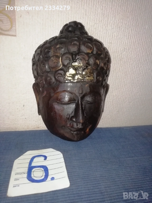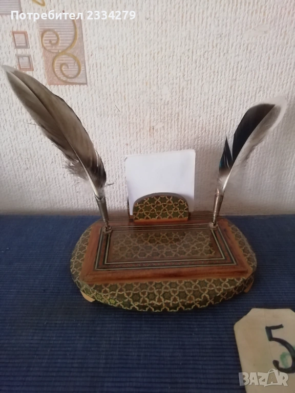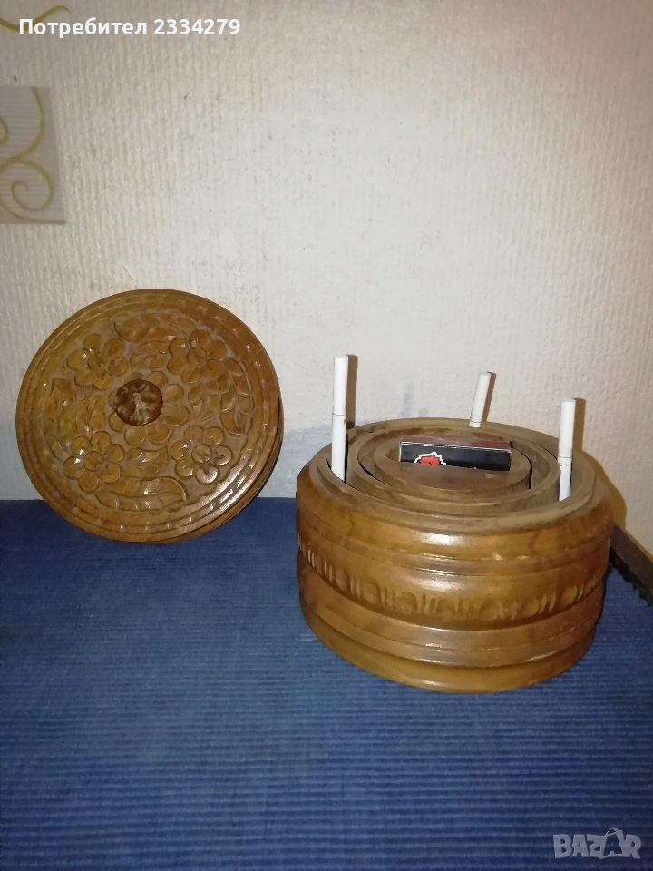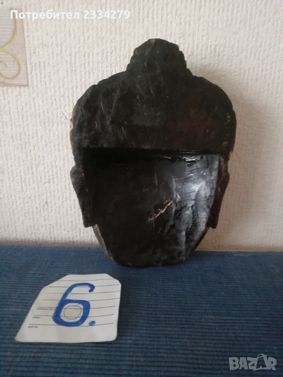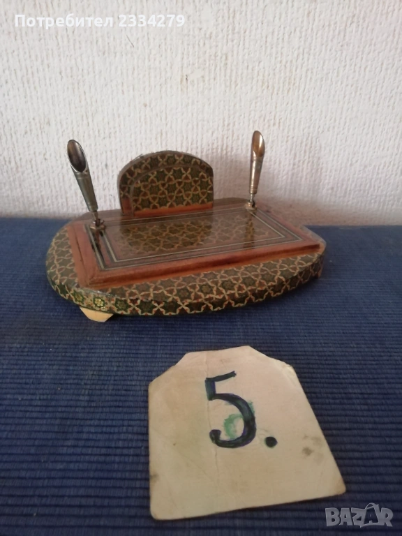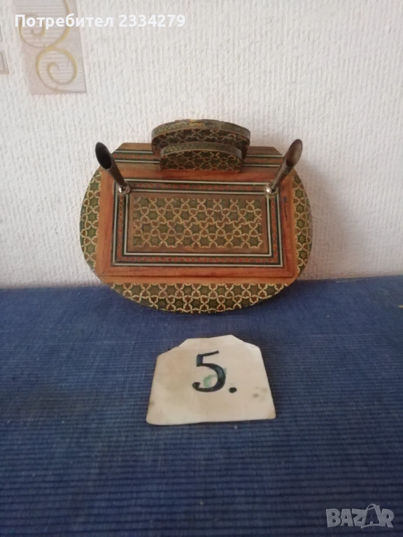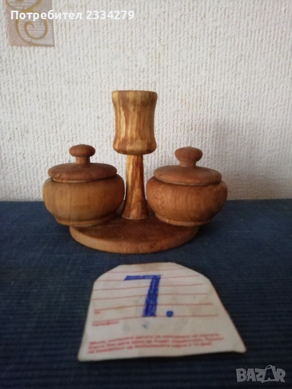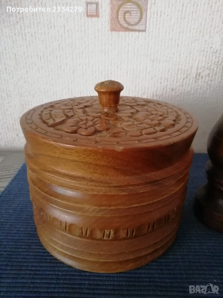 дърворезба с размери 13х10см.,цена 5€., другата с ръчно лепени орнаменти от слама,размери 8х8см., цена 3€.; N:5 стара поставка за писалки и листчета за писане, ръчна изработка орнаментирана от 50-те години,размери 20х15см., цена 5€.; N:6 стара дървена маска ,,БУДДА" ръчна дърворезба, размери 21х15см., цена 7€.; N:7 дървена солница, стара ръчна изработка, размери 16х12см., цена 3€.
