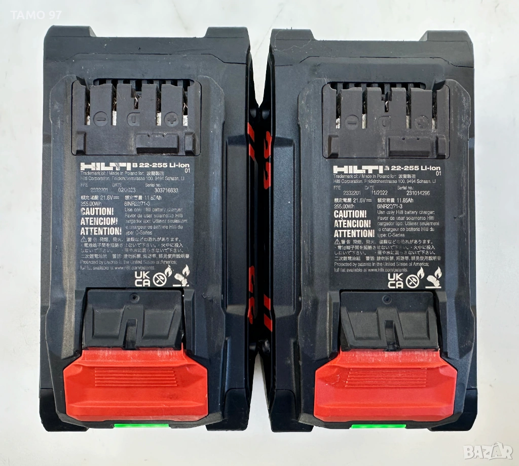Hilti от новата NURON серия. Батериите са по 22V 12.0Ah с индикатор отлично визуално състояние, малко използвани, също така работят и държат перфектен заряд. Оригинално полско произодство са внос от Франция. Обявената цена от 230евро е за една батерия, може и пакетна цена за 2-те за 435евро. Пращаме с опция преглед и тест с куриерска фирма еконт може и лично предаване за гр. Шумен.