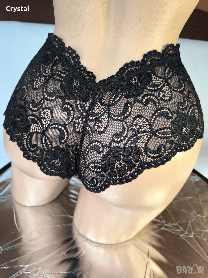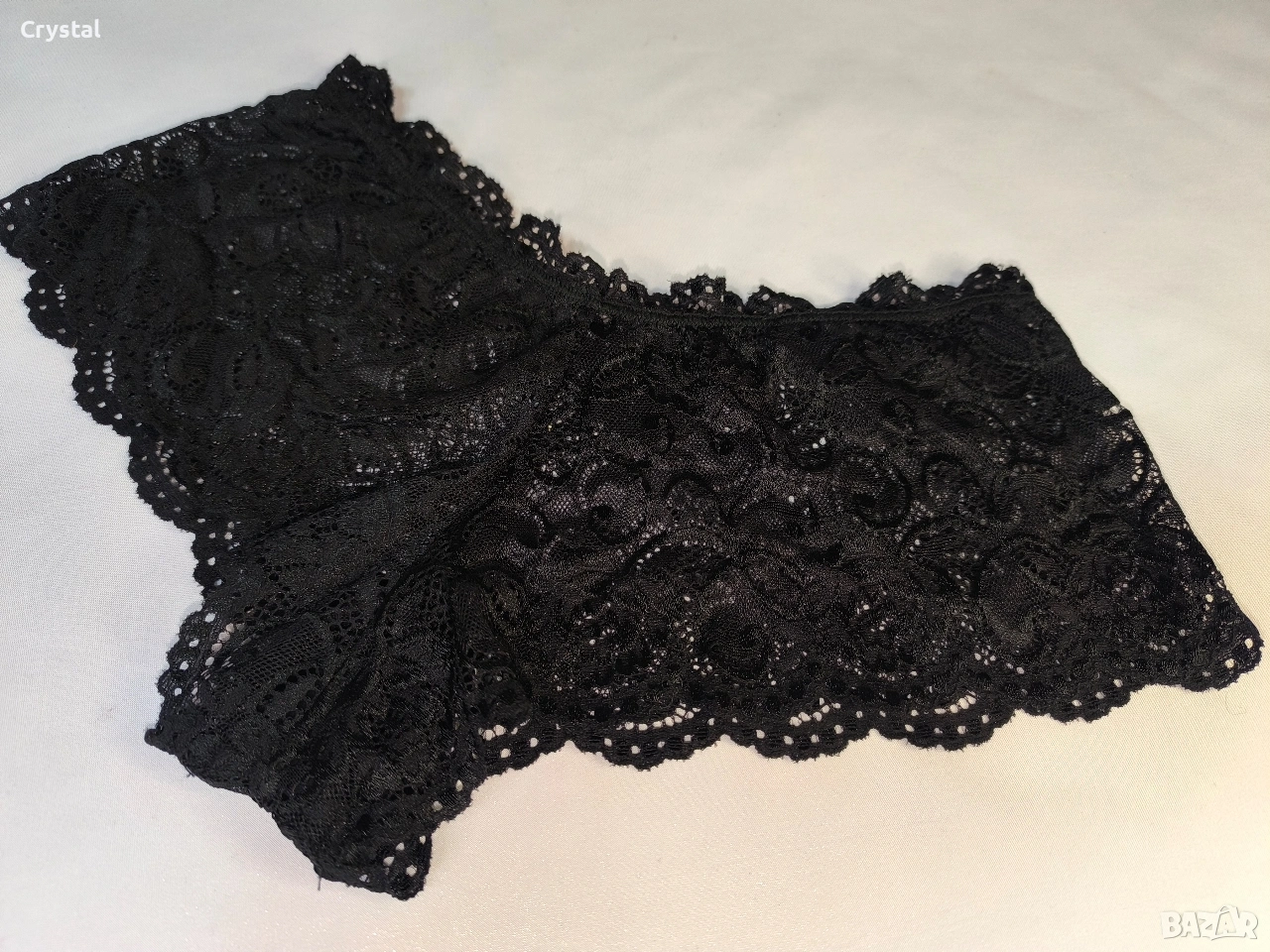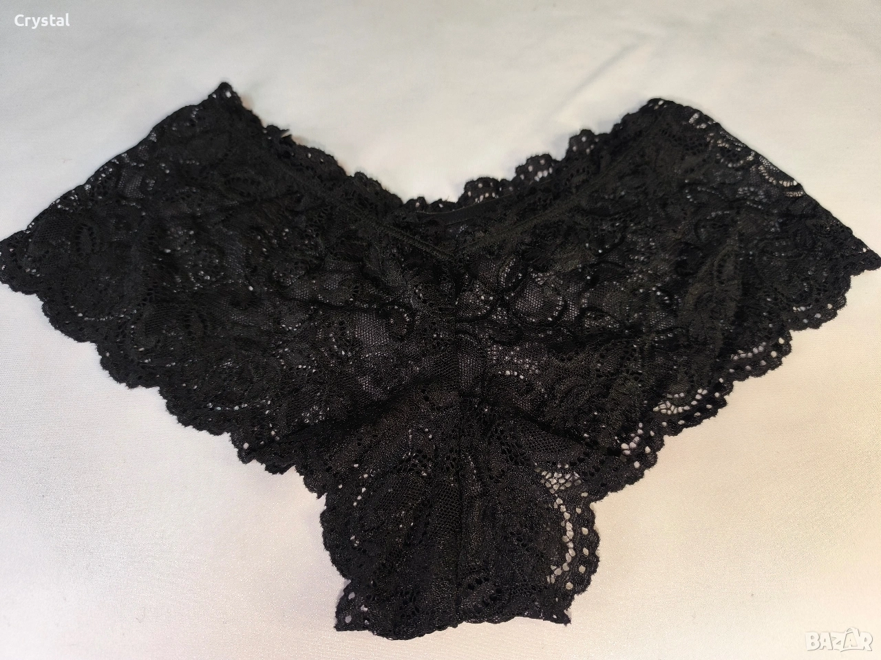 Черни дантелени бикини-бразилиани, в отлично състояние подходящи за М и L размери. Етикетът им е премахнат, без забележки.