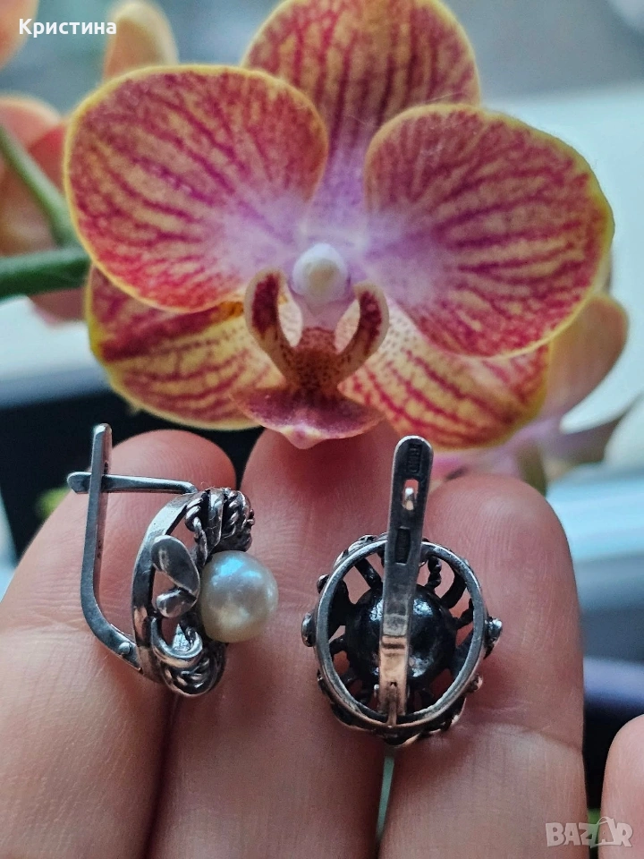 Винтидж руски (СССР) сребърни обеци. От 70-те и 80-те години на миналия век. С английски тип закопчаване и с естествени перли. Проба: 875. Маркировка на звезда, сърп и чук и завода-производител. Цена: 92 €./180 лв.