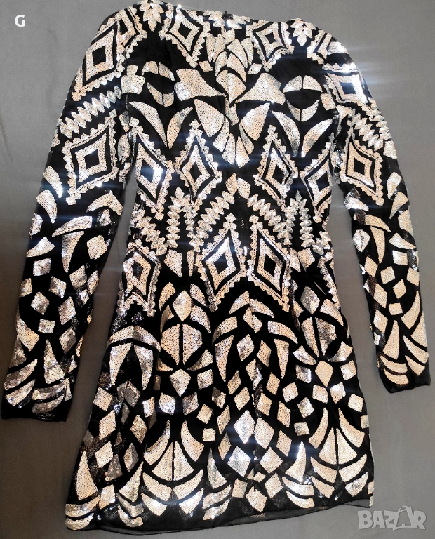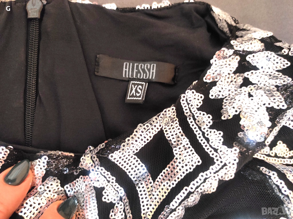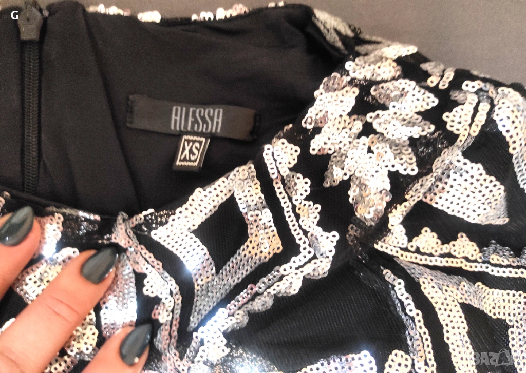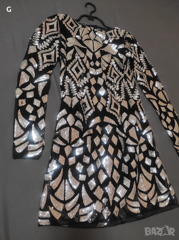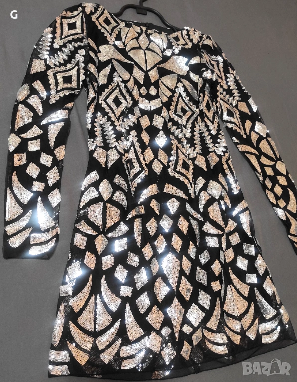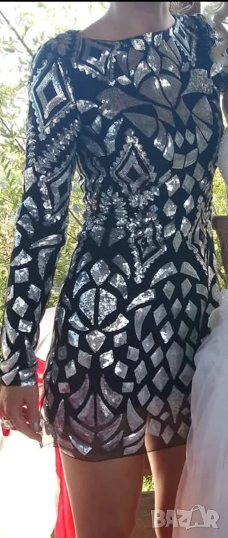 Страхотна парти рокля обшита с фини сребристи пайети.Този модел не може да бъде намерен защото е изчерпан.Стои красиво по тялото без да е стегнато и отговаря на размера си XS.Обличана само веднъж за повод.