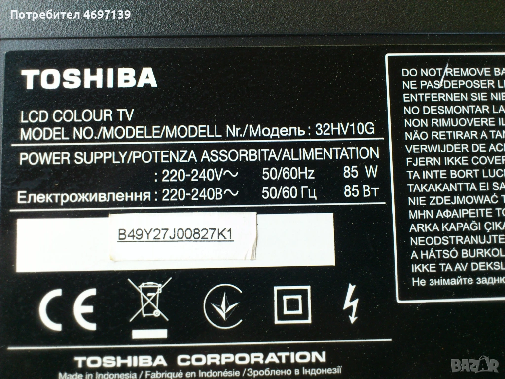 TOSHIBA 32HV10G/-V2BA001347BO/PSIV161COV V71A00023700 → Обява 53067655