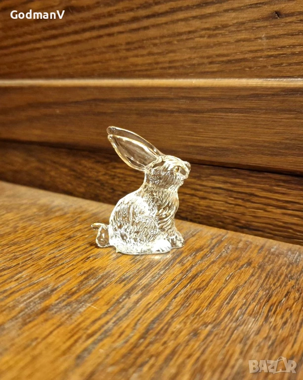 Продавам малка стъклена статуетка на заек в седнала поза. Изработката на статуетката е изключително фина, с акцент върху релефните детайли на тялото и главата.