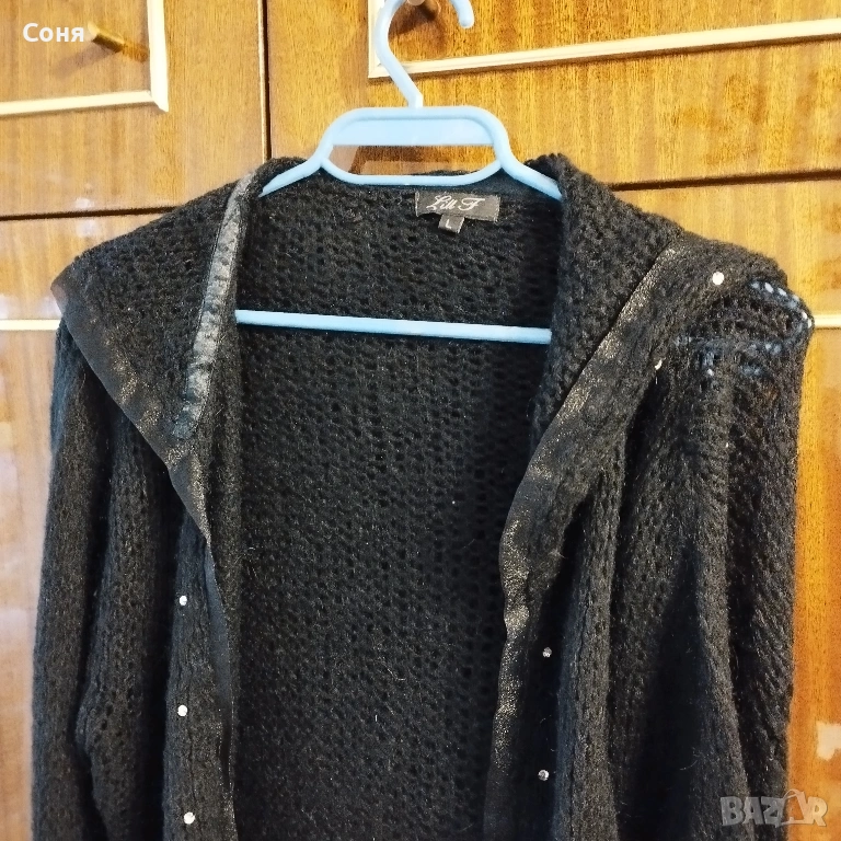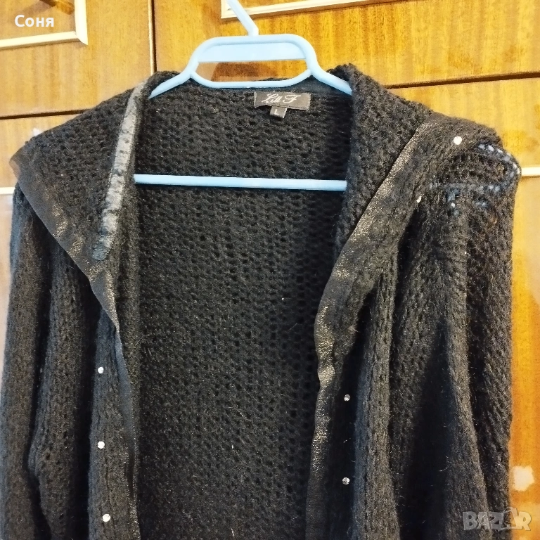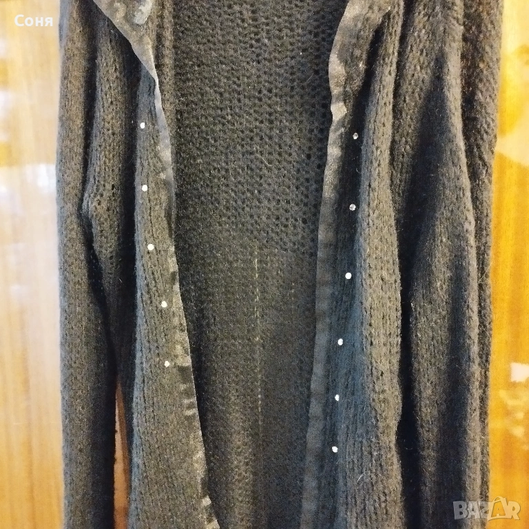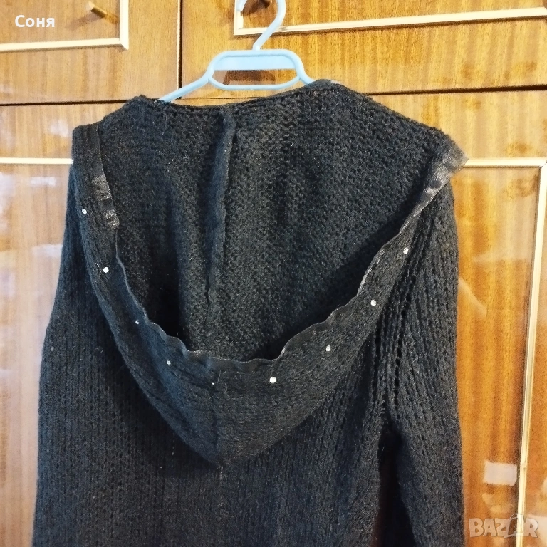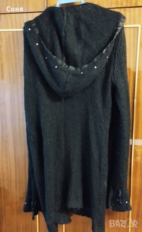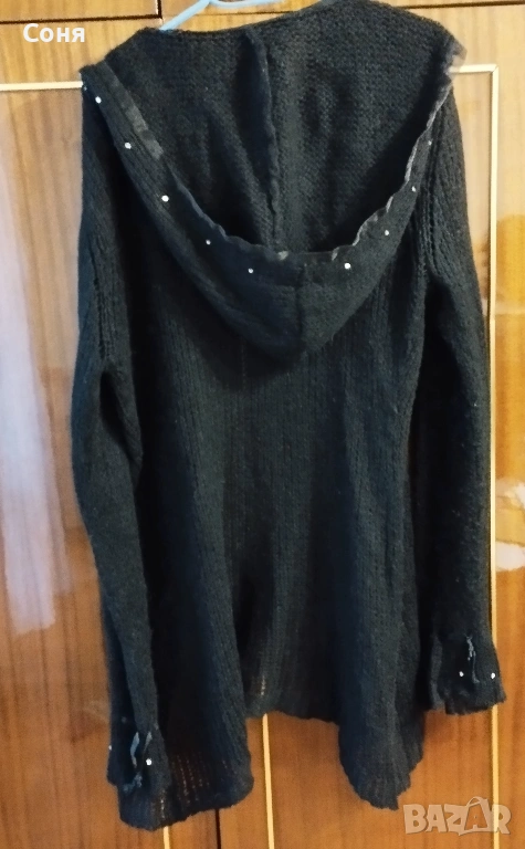 Дамска жилетка с качулка в черно, без закопчаване, с камъни, ефирно плетиво от вълна. Размерите са от рамо до рамо - 48см., талия-90см., бюст - 90см., дължина- 83см, ръкав -73см.