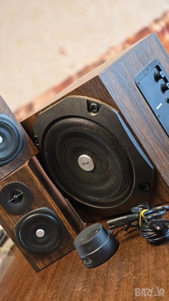 Тонколони Trust Vigor Wireless 2.1 с Bluetooth. Работят отлично, може да се слуша музика както с кабел, така и безжично чрез Bluetooth.