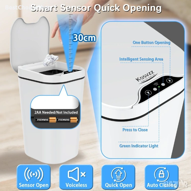 Кошче за боклук със сензор за движение, автоматично инфрачервено засичане, като 0,1 секунди след засичане автоматично отваря капака и автоматично го затваря, ако не се засече движение на обект в рамките на 5 секунди. Безконтактното кошче за боклук се захранва от 2 AA батерии (не са включени)