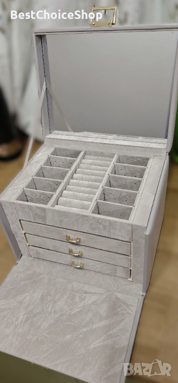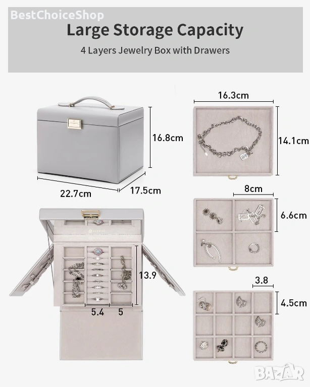 кутия за бижута е съставена от четири слоя и структурата на всеки слой е различна. Отделение за обеци, слот за пръстени, отделение за обеци, място за гривна, голямо чекмедже... С 8 кукички от двете страни