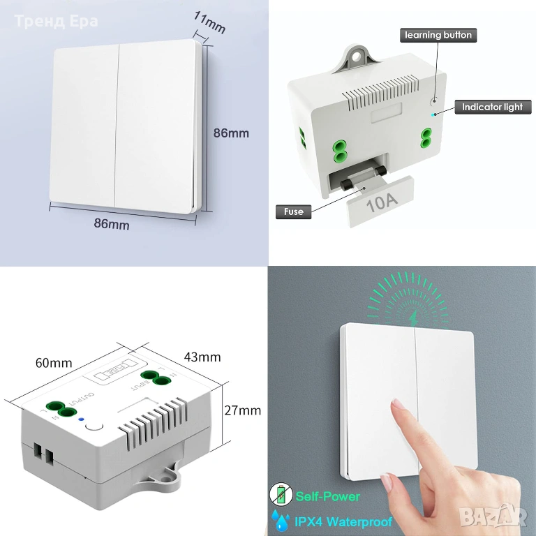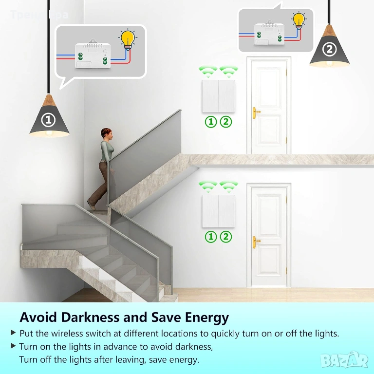 Висококачествен ключ: самогенериращият се безжичен ключ може да се щракне над 200 000 пъти. Безопасен и водоустойчив IPX4, може да се инсталира директно в банята, кухнята и др. Дори мокри ръце могат да докоснат безжичния ключ. Не се притеснявайте за токов удар и ако батерията е мокра и ръждясала. Удобен и грижовен начин на употреба за деца и възрастни хора.