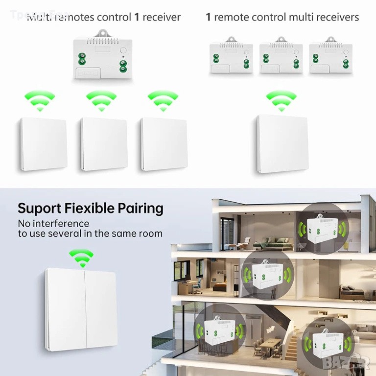 Широко приложение: продуктите могат да се използват в домакинства, ферми, фабрики, офиси, лаборатории, супермаркети и др. Можете дистанционно да управлявате всяко устройство, свързано към приемника, чрез безжичния превключвател. Като лампа, осветление, вентилационно устройство, устройство за изхвърляне на хранителни отпадъци, DIY радио щепсел, предаване на сигнал и т.н.