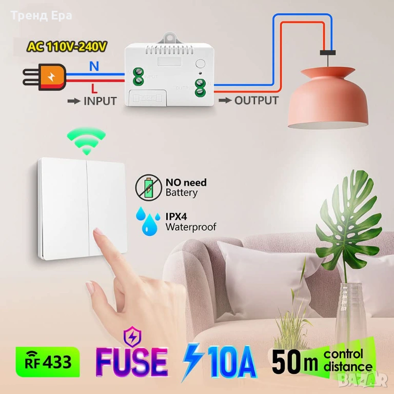 Страхотен дизайн: RF самогенериращ се безжичен ключ за осветление. Можете дистанционно да включвате/изключвате осветление или други устройства, които се свързват с този релеен приемник, чрез кинетичния безжичен ключ. Стабилна и надеждна работа с висока чувствителност на приемане (>-97dBm). Предаване на високочестотни сигнали. Силният сигнал може да преминава през стени, подове, врати, дъски и др. Може да се управлява на закрито в рамките на 50 метра разстояние.