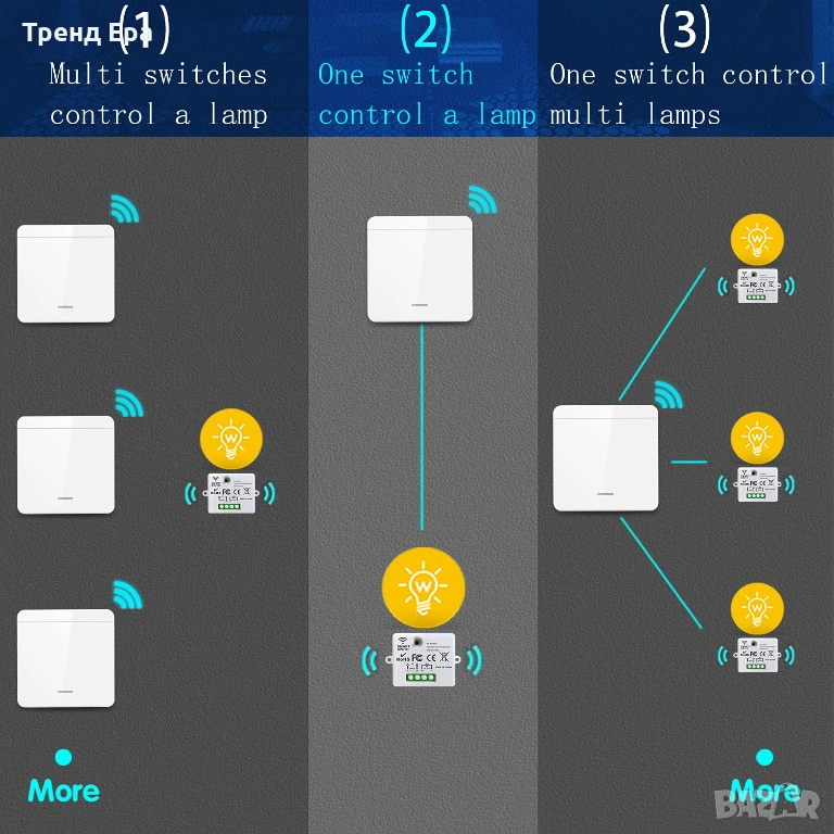 Всеки приемник може да съхранява около 10 безжични ключа. Така че можете да споделяте ключовете със семейството си. Всички можете дистанционно да управлявате устройството, свързано с приемника. Един предавател може да управлява и множество приемници. Например, 1 ключ, монтиран на стената до вратата на спалнята, и друг, поставен на нощното шкафче.