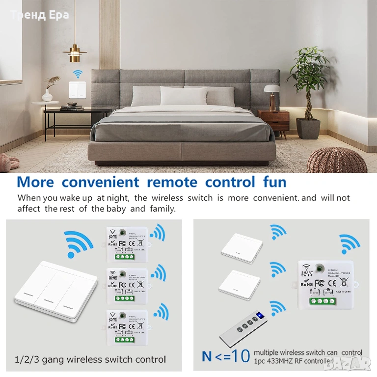433Mhz RF безжичен ключ за осветление. Не е необходимо окабеляване между осветлението и ключа. Стабилна и надеждна работа с висока чувствителност на приемане (> - 97dBm). Предаване на радиочестотен сигнал. Силният сигнал може да преминава през стени, подове, врати, табла и т.н. Може да се управлява на разстояние до 50 метра на открито.