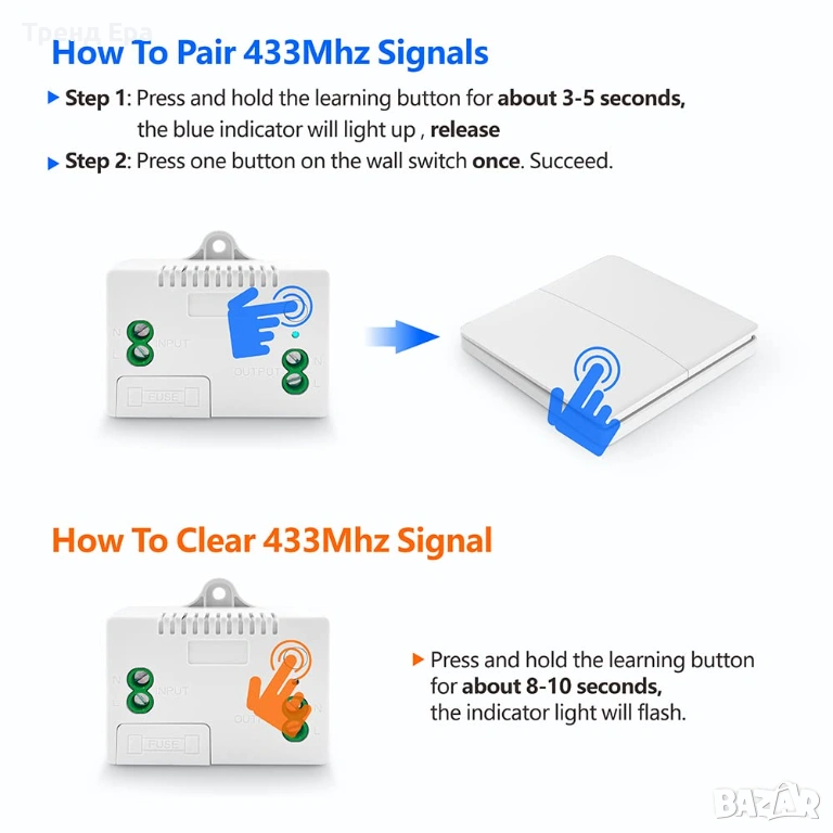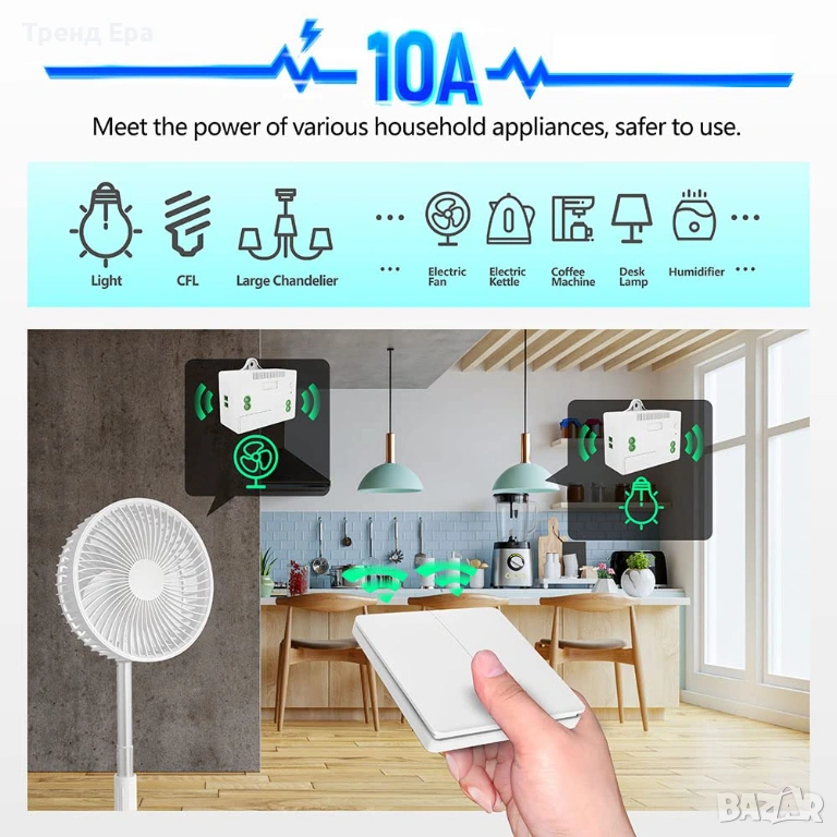 Висококачествено реле, което може да се използва над 400 000 пъти. Този приемник използва 10-амперно реле, което може да натоварва електрически уреди с висока мощност. Максималното натоварване на контролера е 1500 W. Приемникът е подходящ за променливо напрежение 110V~240V, така че AC 110V/220V/230V/240V е приемливо.