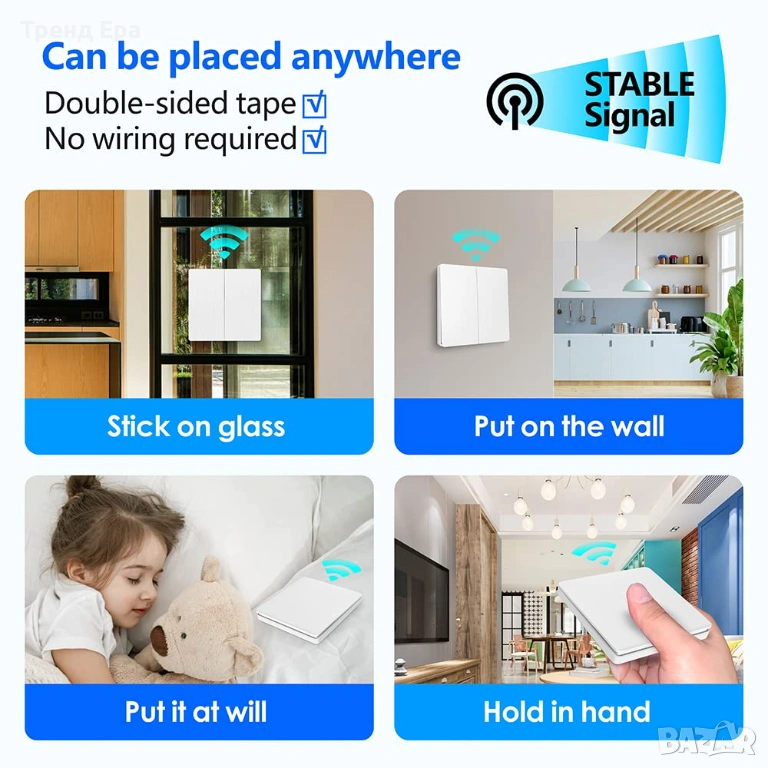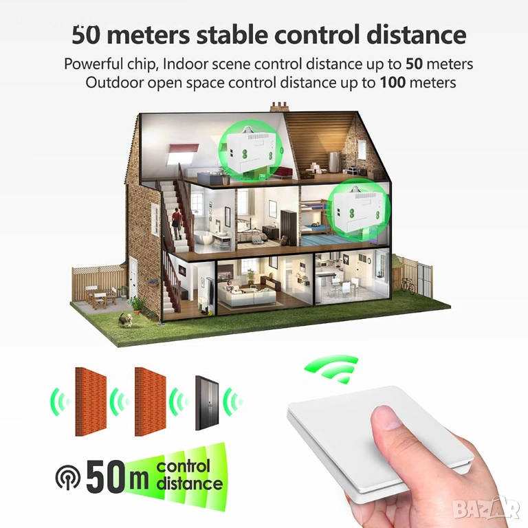 Самогенериращият се безжичен ключ може да бъде щракнат над 200 000 пъти. Безопасен и водоустойчив по IPX4 стандарт, може да се инсталира директно в банята, кухнята и т.н. Мокри ръце могат да докоснат безжичния превключвател. Не се притеснявайте от токов удар и намокряне на батерията, което може да ръждяса. Подходящ и грижовен начин на употреба за деца и възрастни хора.