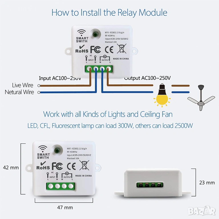 Мини безжичен WiFi превключвател с малък размер, което го прави подходящ за стенни кутии за управление във Великобритания и ЕС. Мини размерът на приемника е 47*42*23 мм. Инсталира се между захранването и устройството, което може лесно да се скрие в повечето електрически кутии или разклонителни кутии, или да се използват винтове за фиксиране към платката. Можете лесно да го инсталирате, за да управлявате осветление или щепсел. Не е необходимо окабеляване.