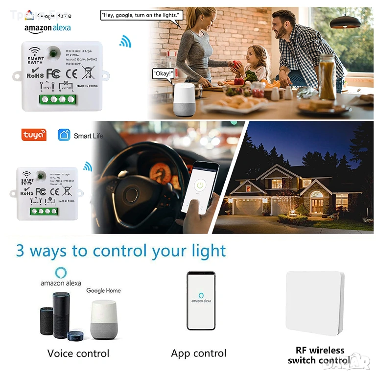 Безжичният WiFi превключвател е съвместим с Amazon Alexa (Amazon Echo/Echo Dot/Amazon Tap) и Google Home Assistant. Той ви позволява да използвате гласа си, за да управлявате домашни устройства и да се наслаждавате на свободно управление на ръцете.