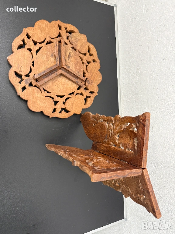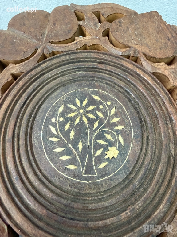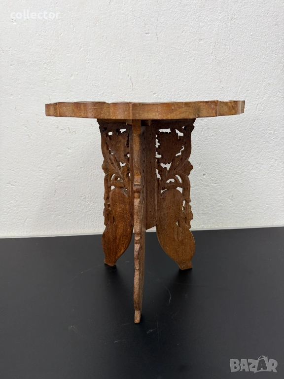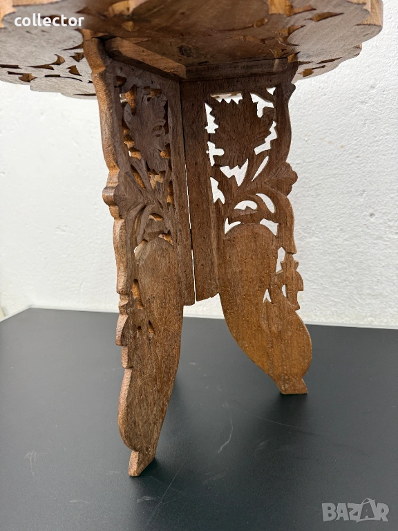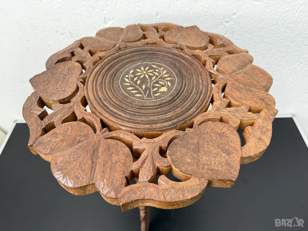 Трикрака сгъваема дървена маса, изцяло ръчна дърворезба. Основни флорални, листни мотиви, набивки от биволска кост. Същата може да се използва като декор, маса за кафе или цветарник. Състояние видно от снимките.