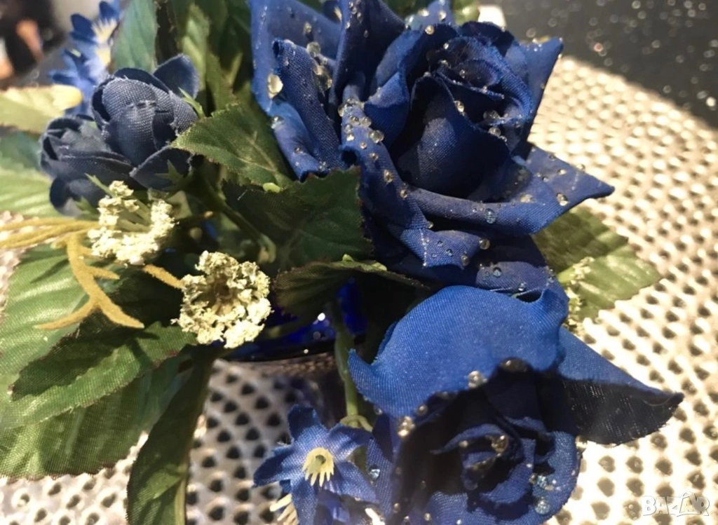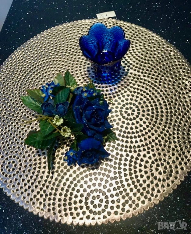 Състои се от златиста гумирана подложка за масичка (с етикет), както и от син свещник и поставка за него от нежни, сини рози. Комплектът се продава наведнъж, не и поотделно. Цена 20 евро