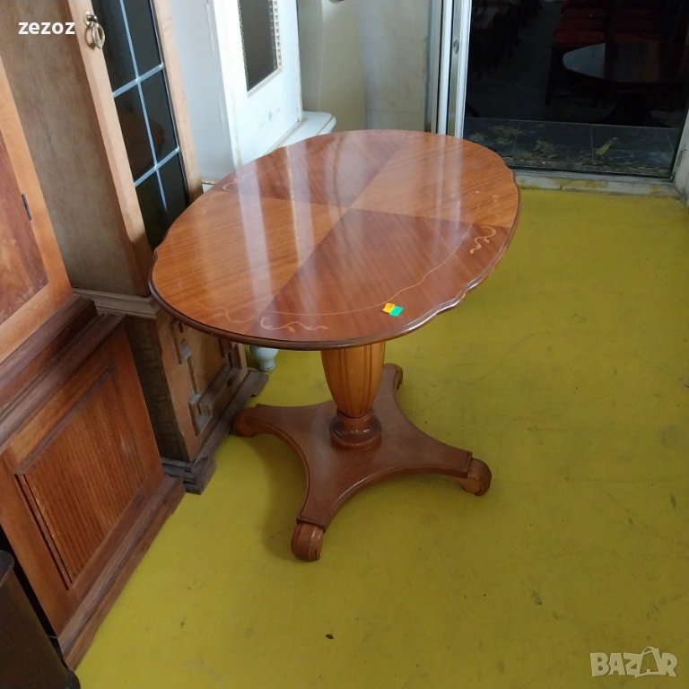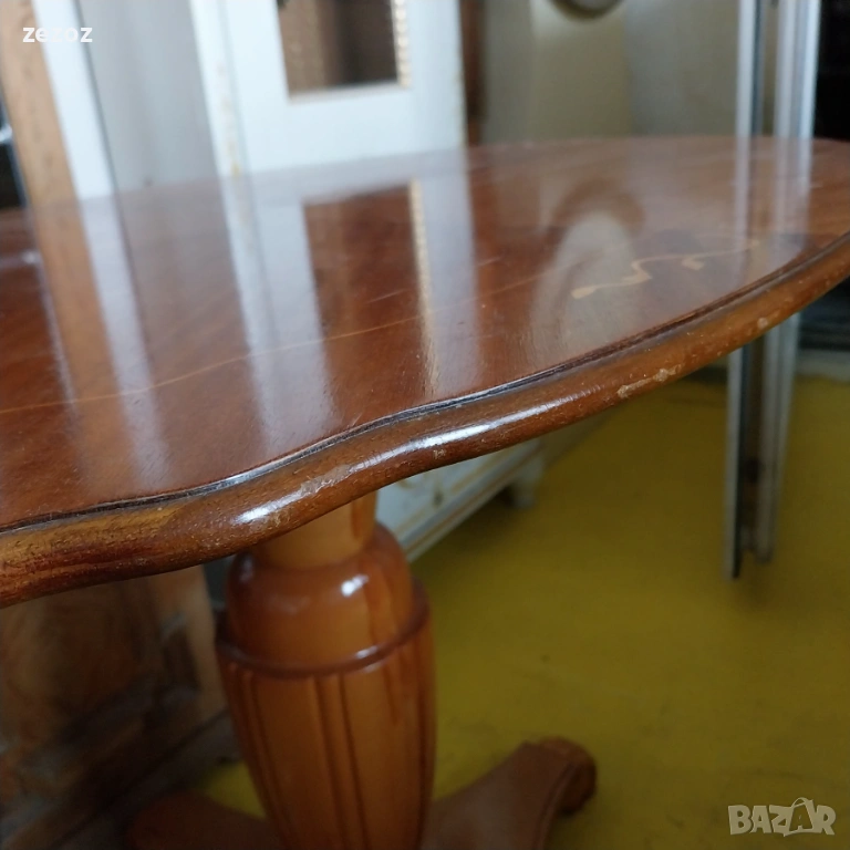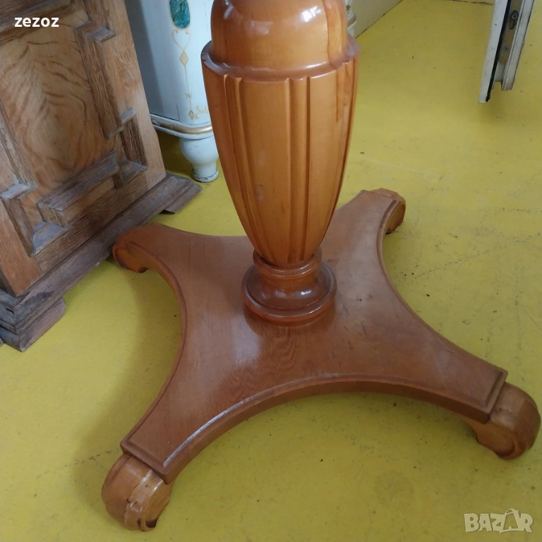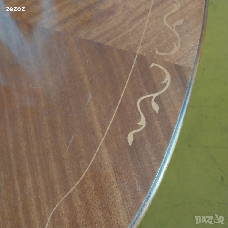Красива холна маса,изработена от масив в стил"Бидермайер".Стабилен централен крак с четири опори.Плот оформен с фурнир от шведска бреза и интарзия.Масата е малко по-висока от стандартите за холна маса.Конструктивно здрава и запазена с минимални козметични забележки по плота.Размери-