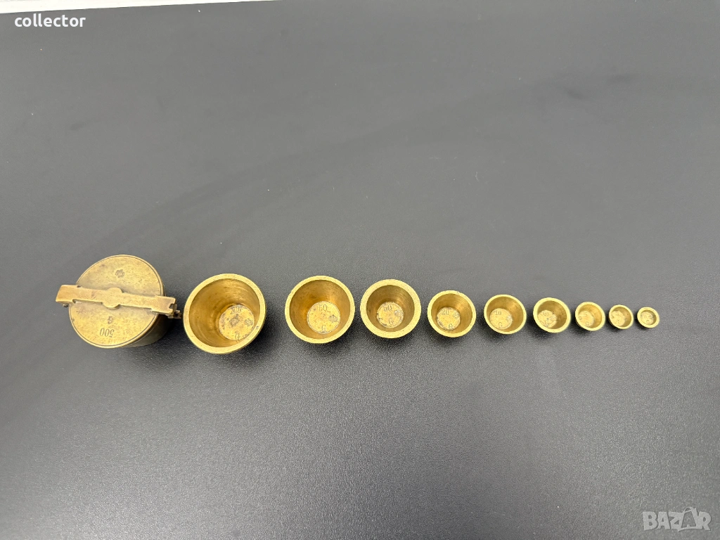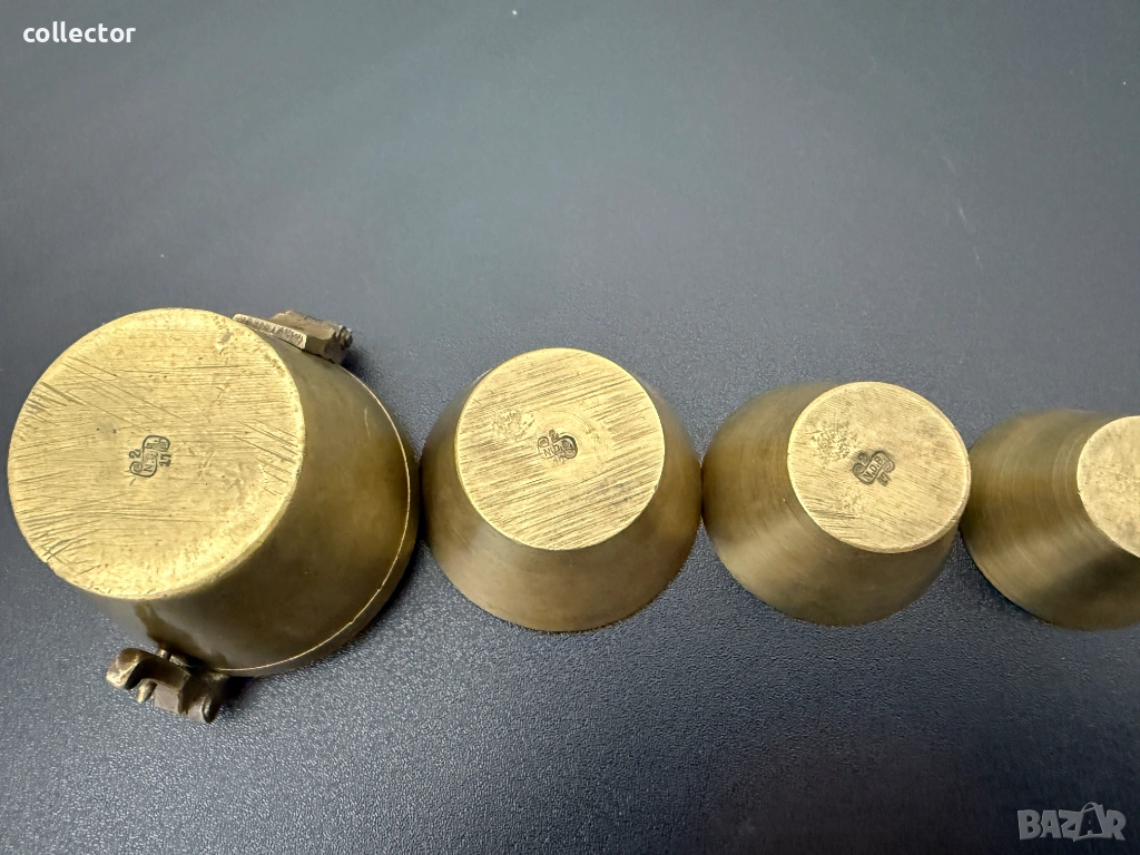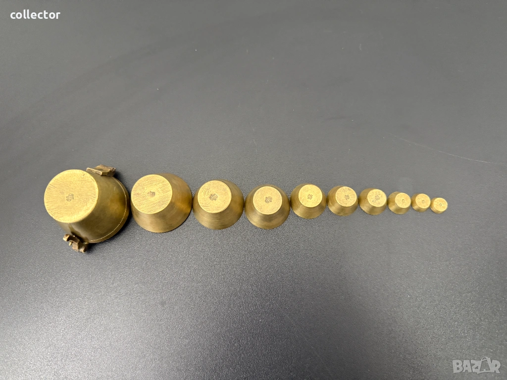 Бронзови тежести за везна, известни още като гнездови тежести. Калибрирани измервателни чаши, били използвани в миналото, най-вече от аптекари или търговци, за прецизно измерване на различни количества стоки.