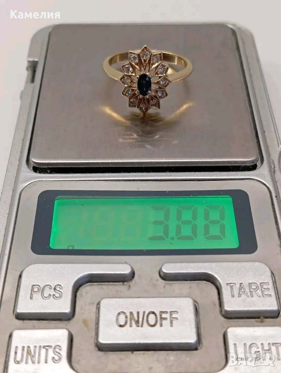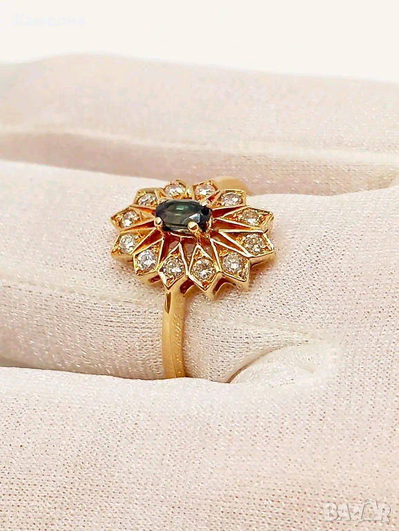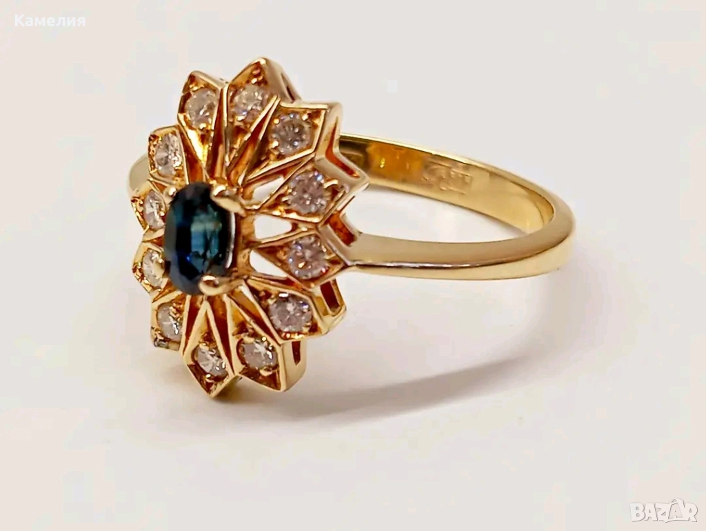 Красив руски златен пръстен Малинка с брилианти и сапфир. Проба 585 глава с кокошник. Грамаж 3,88 грам. Диаметър 18,5 мм. 12Бр57-0,26сt, сап-0,3сt.