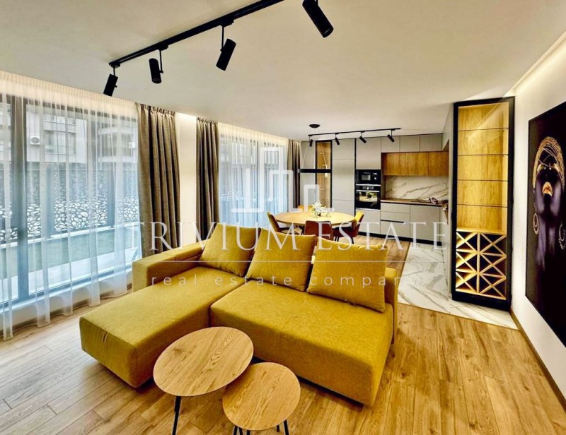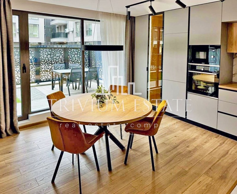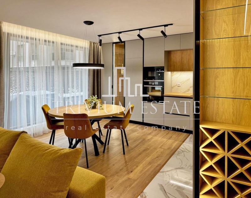 Апартаментът е изцяло обзаведен с нови дизайнерски мебели и оборудван с всички необходими електроуреди от висок клас. Интериорът е модерен, елегантен и създаден с внимание към комфорта и детайла.
