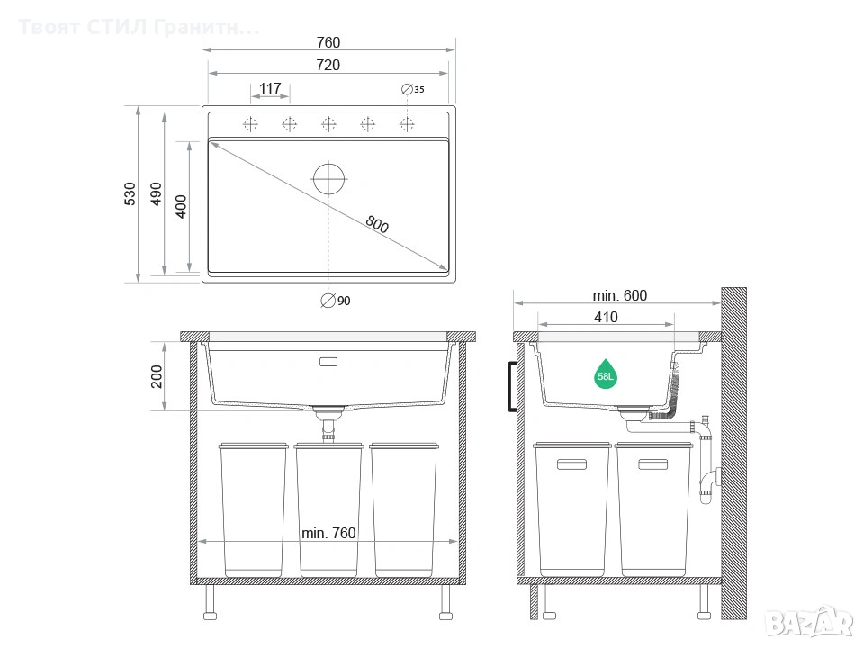 - За вграждане (монтирана под плот) гранитна кухненска мивка за шкафове 80 см