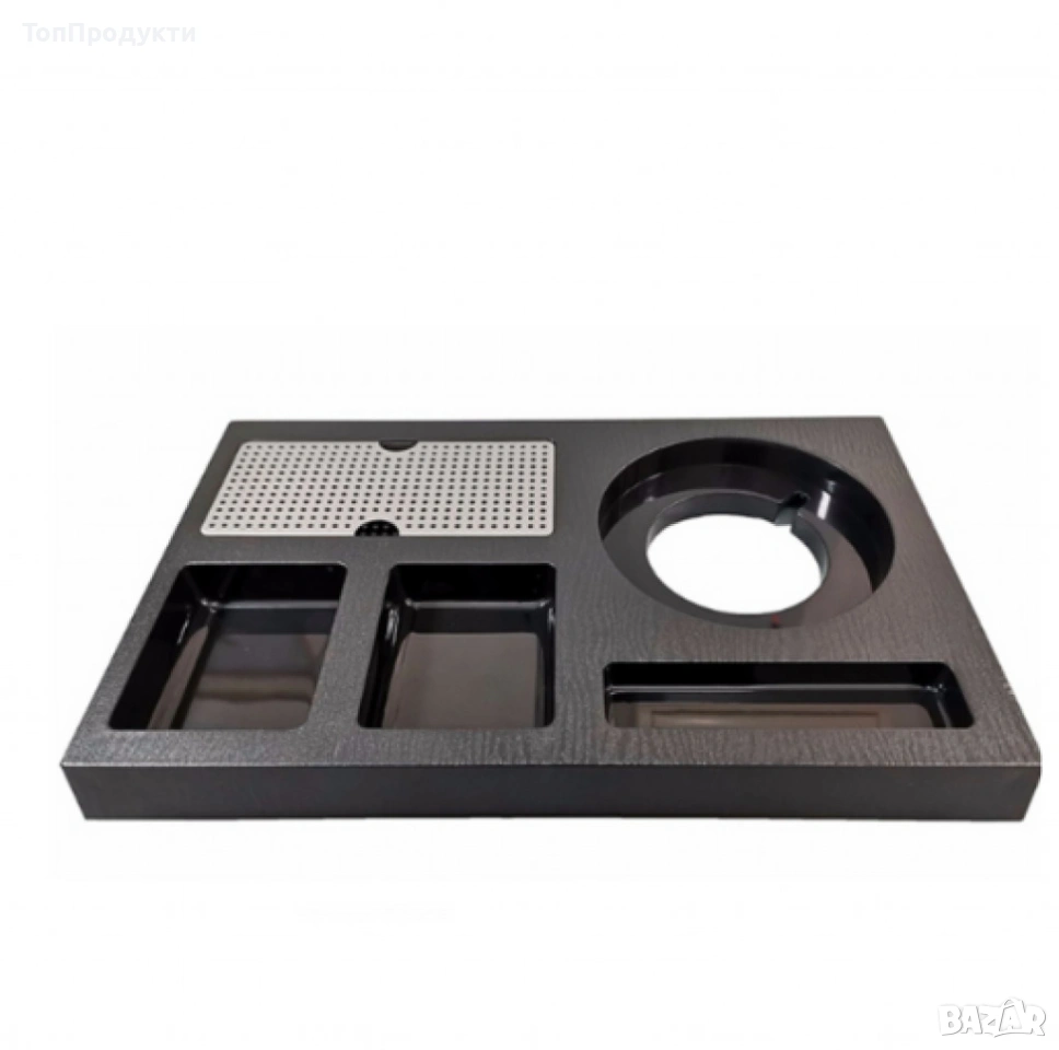 -Поднос с размери 36х24 см, със специални гнезда за чаши, пакетчета чай или кафе и бъркалки, Специално гнездо с решетка от неръждаема стомана за отцеждане или поставяне на топли чаши,