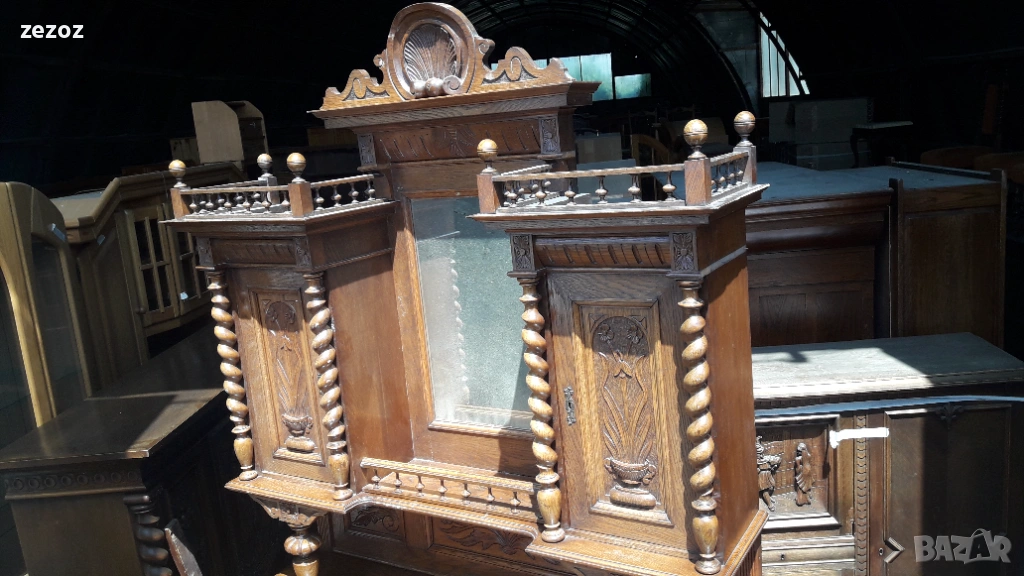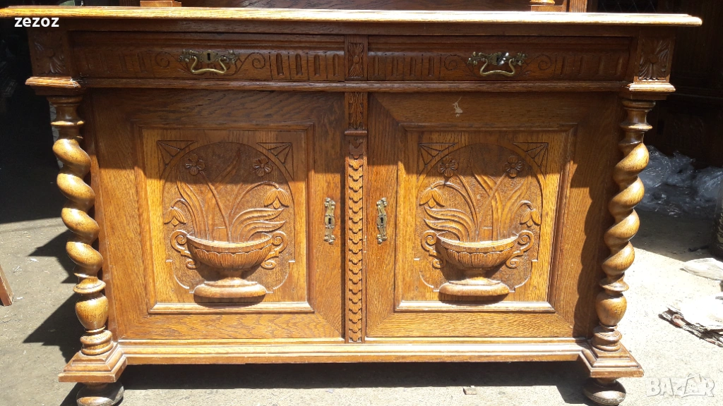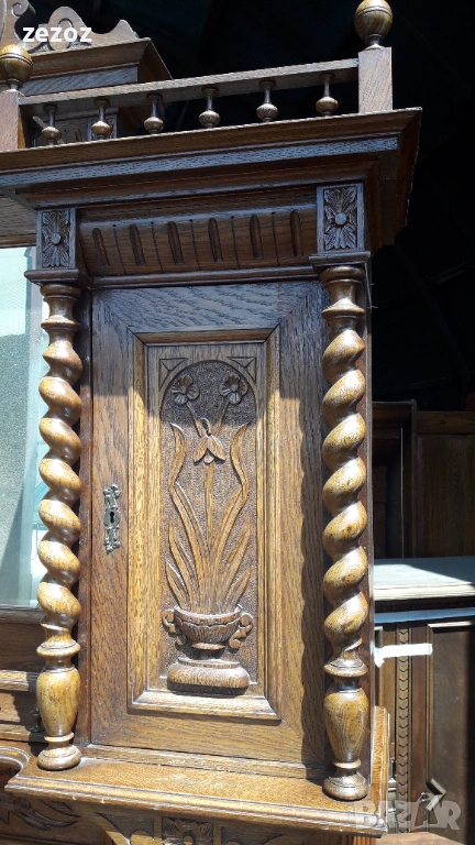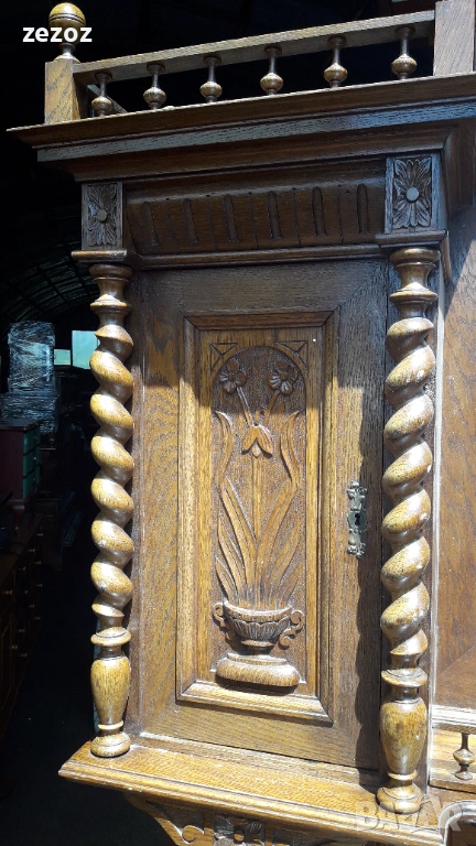 Антикварен шкаф изработен в стил "Неоренесанс".Пълен дъбов масив.Ръчна дърворезба и спираловидни усукани колони.За годините си е много добре запазен.Дели се на две основни и една по малка част. Размери-