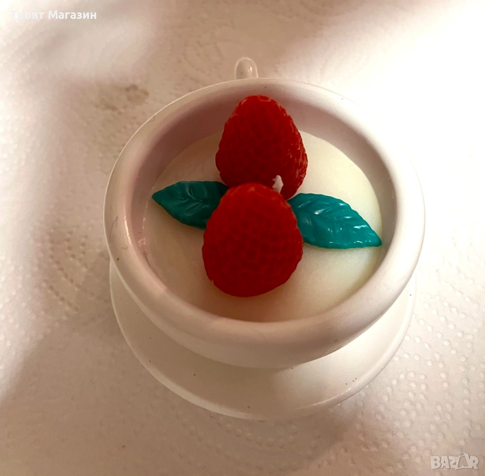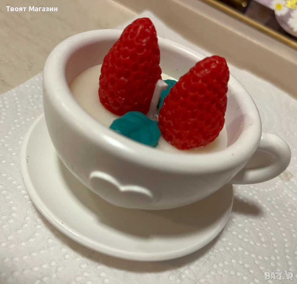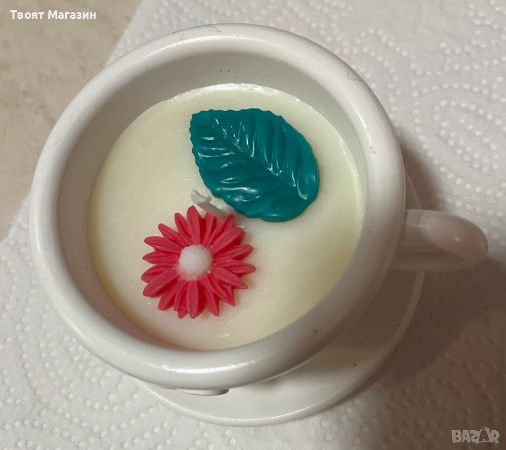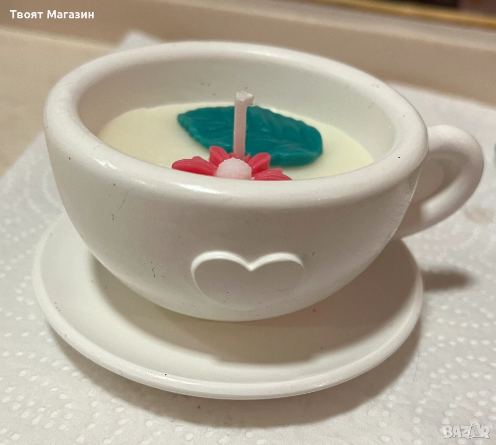 Ръчно изработена ароматна свещ в съд от еко смола – Сърце/Чашка с флорална декорация → Обява 53071268
