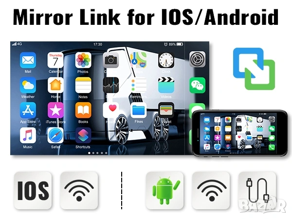 * Интелигентно свързване (Mirror Link): Възможност за огледално прожектиране на екрана на смартфона върху дисплея на радиото. Поддържа iOS (през WiFi) и Android (през USB/WiFi).