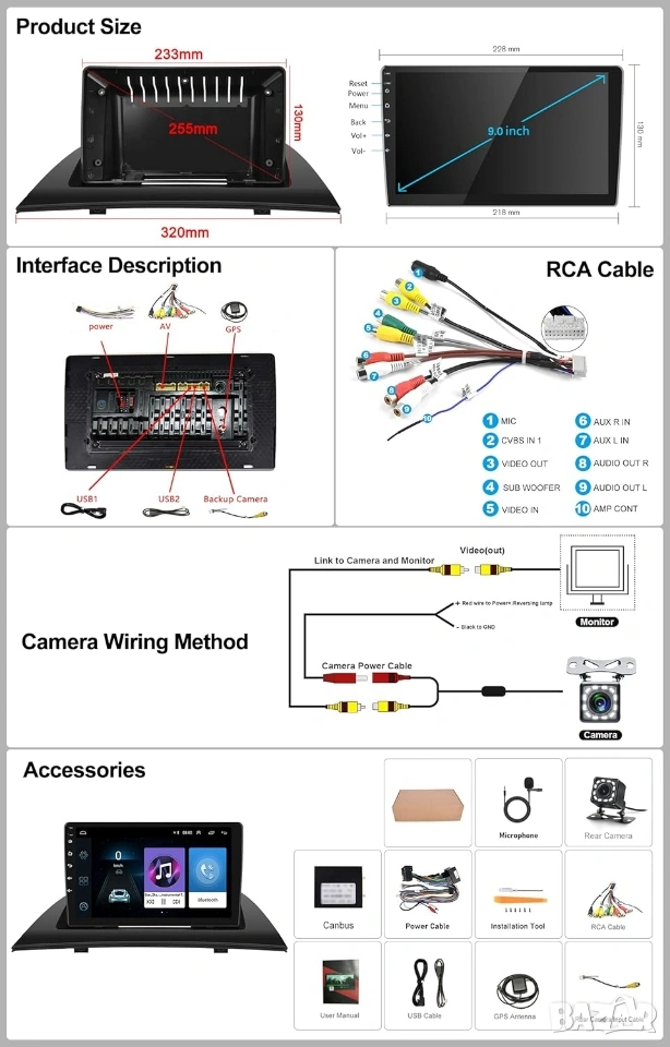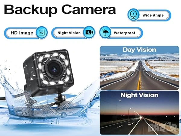 * Камера за задно виждане: Включена в комплекта HD камера със 170° ъгъл на видимост, водоустойчивост и нощно виждане. Системата автоматично превключва към изображението от камерата при включване на задна предавка.