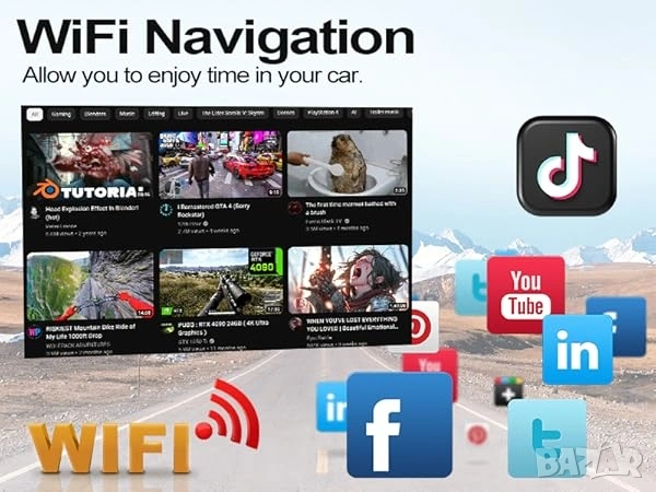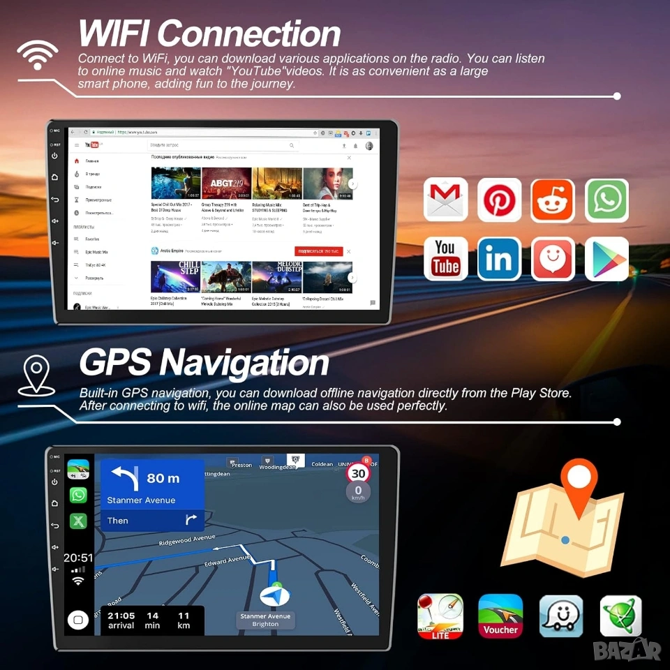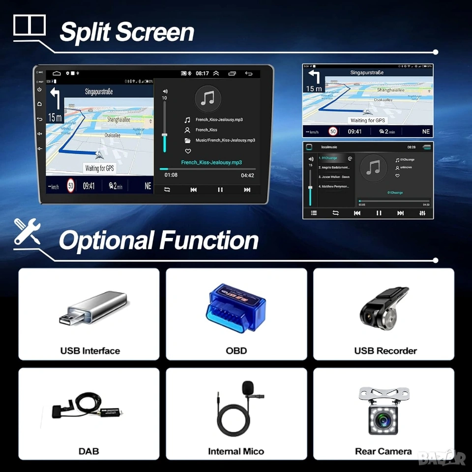 * Разделен екран (Split Screen): Възможност за едновременно използване на две приложения (например навигация и музикален плеър) на един екран.