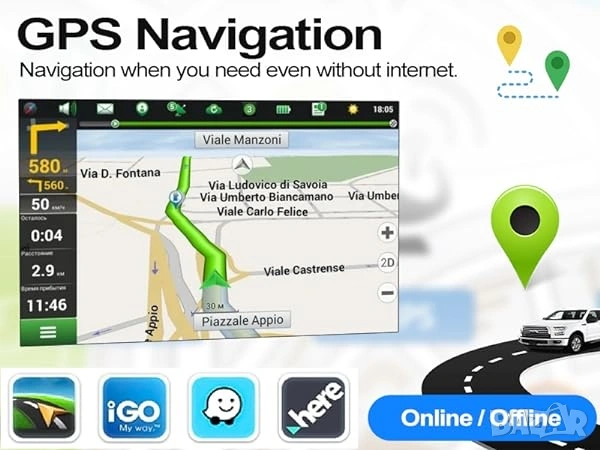 * GPS Навигация: Вграден GPS приемник с поддръжка на онлайн карти (Google Maps) и офлайн навигация чрез приложението Here WeGo.