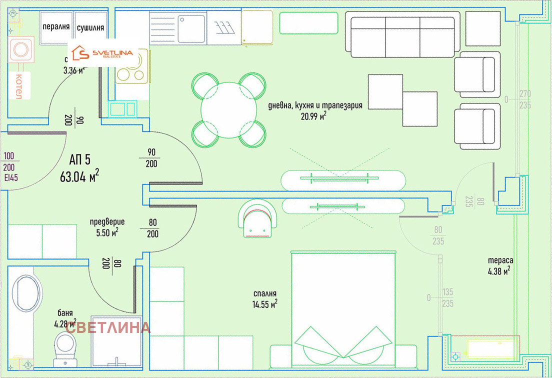 - Застроена площ: 63 кв.м.;
