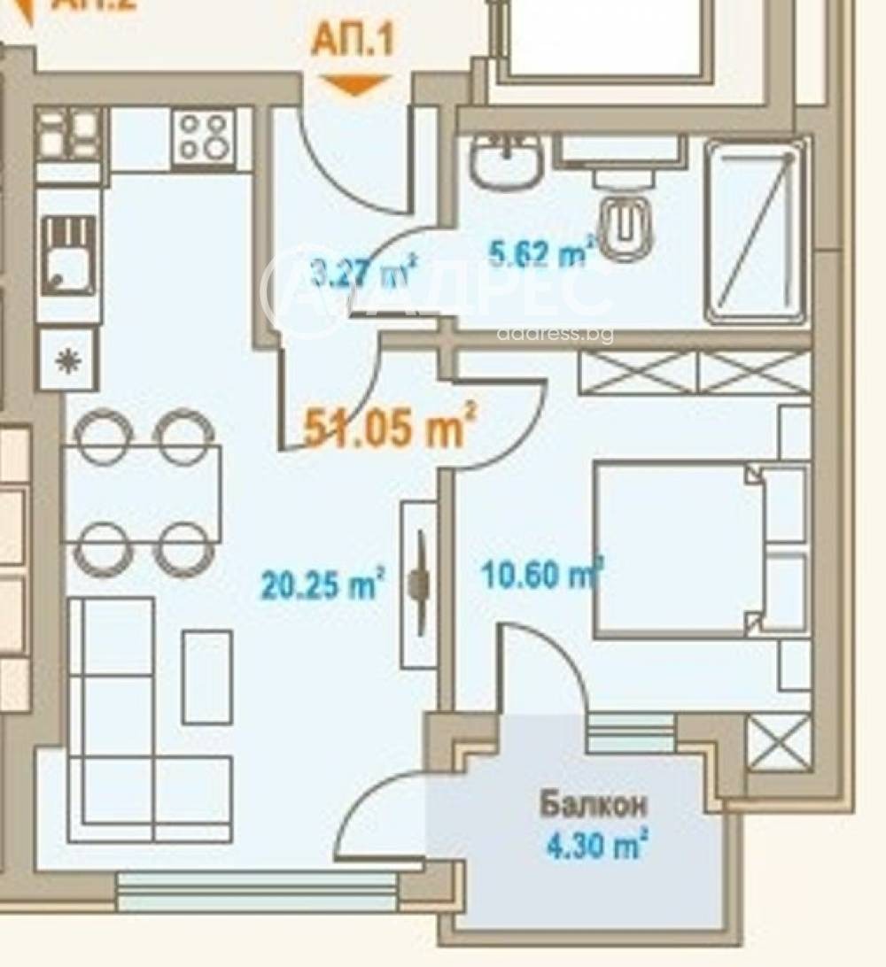 Двустаен апартамент със ЗП 51 кв.м, с общи части 76 кв.м.
