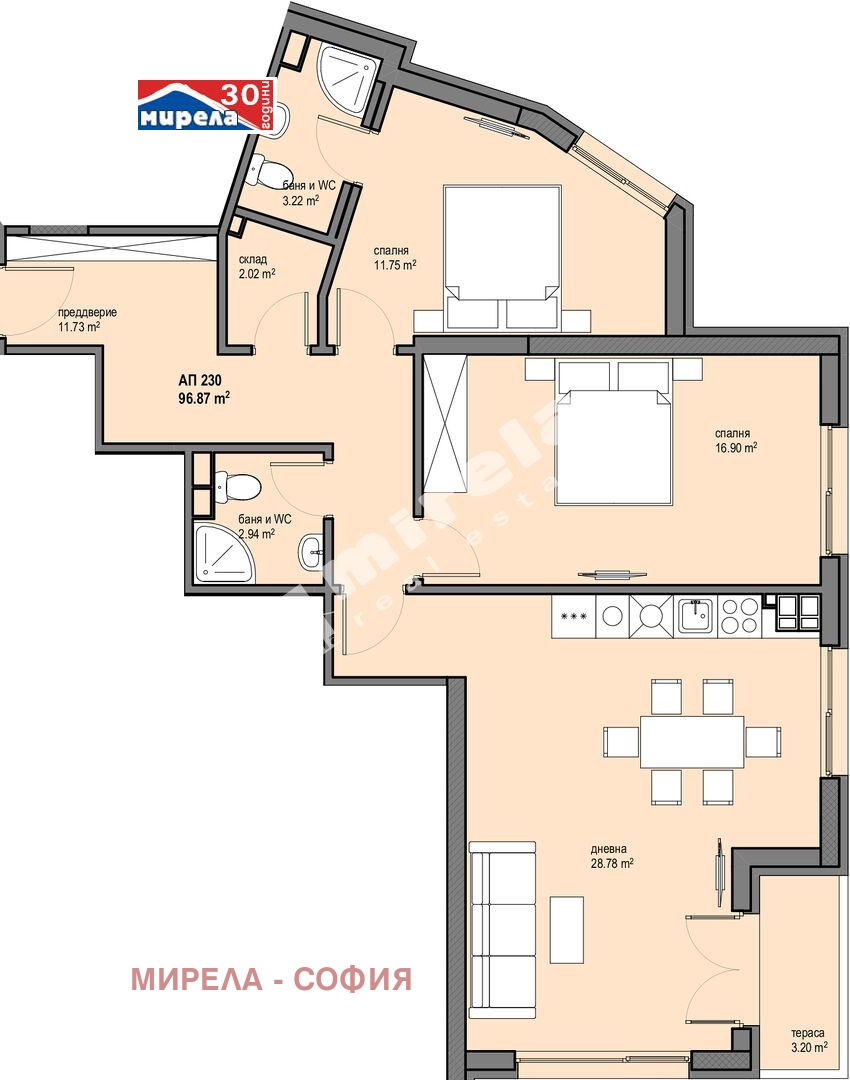Предлагания 3-стаен апартамент е със следното разпределение: коридор, дневна с кухненски бокс и трапезария, две спални, две бани с тоалетна, склад и балкон.