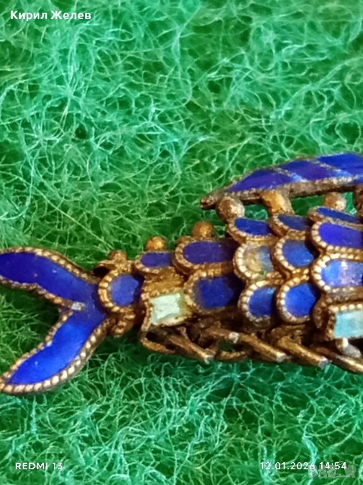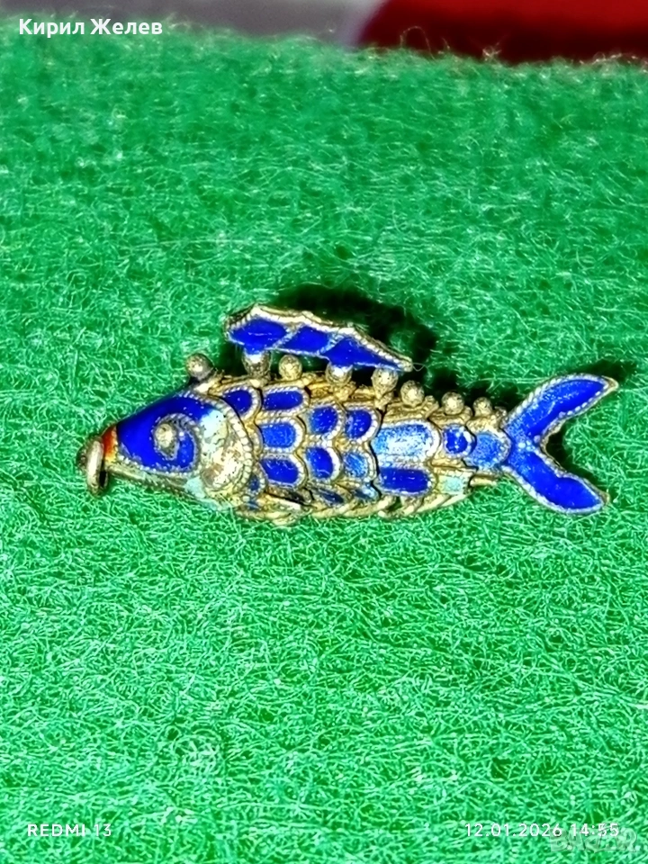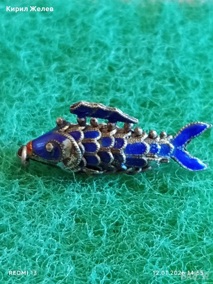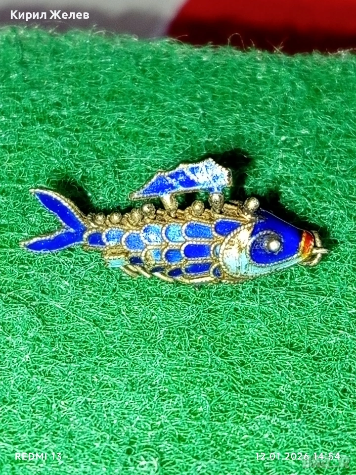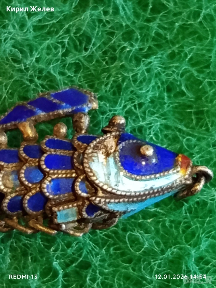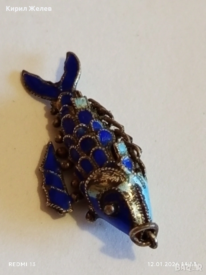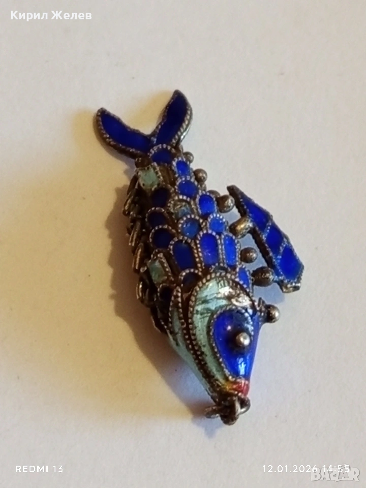 Винтидж сребърен медальон Риба син емайл рядък нестандартен подарък 52573