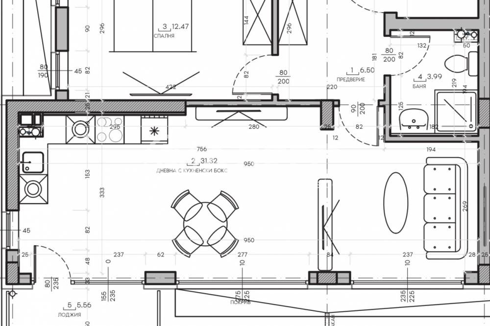 хол с кухненски бокс, спалня, баня с тоалетна, ложия.