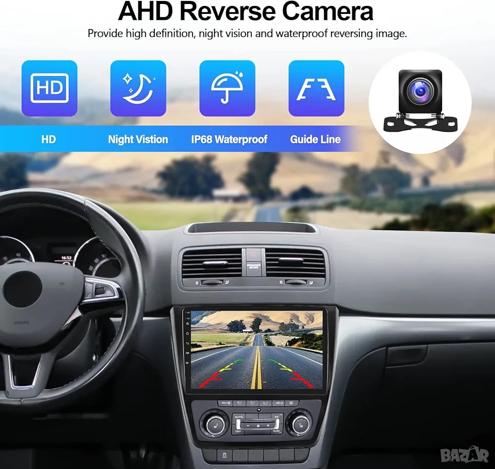 * AHD Камера за задно виждане: Включена в комплекта HD камера с широк ъгъл на виждане, водоустойчивост и нощно виждане. Автоматично превключване при включване на задна предавка.