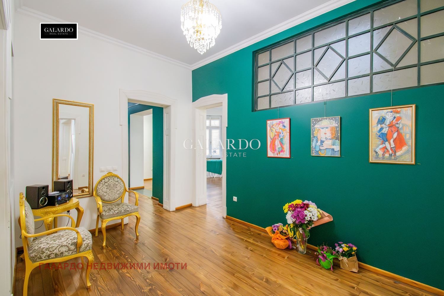 Пространството впечатлява с високи тавани, оригинални орнаменти и автентичен дървен под, създаващи усещане за стил и представителност.