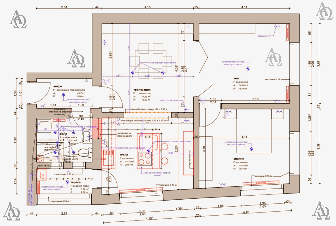 Имотът е след цялостна реконструкция и реновация, като всичко по него напълно ново. Изцяло саниран - поставена е вътрешна и външна изолация на 49 сантиметровите стени. Подменена дограма с висококачествена 6-камерна ПВЦ дограма на Шуко. Цялостно са подменени Ел и ВиК инсталациите, прокарана е газова инсталация за отопление и бойлер за топла вода. Кухнята е също след ремонт, като са поставени нови мебели от масивно дърво - дъб, плотовете са от рядък доламитен мрамор, също разполага с централно разположен остров от масивно дърво и мраморен плот.
