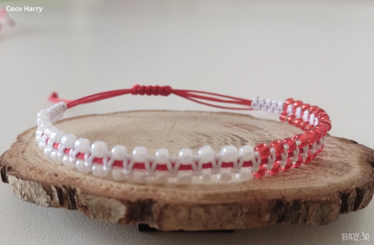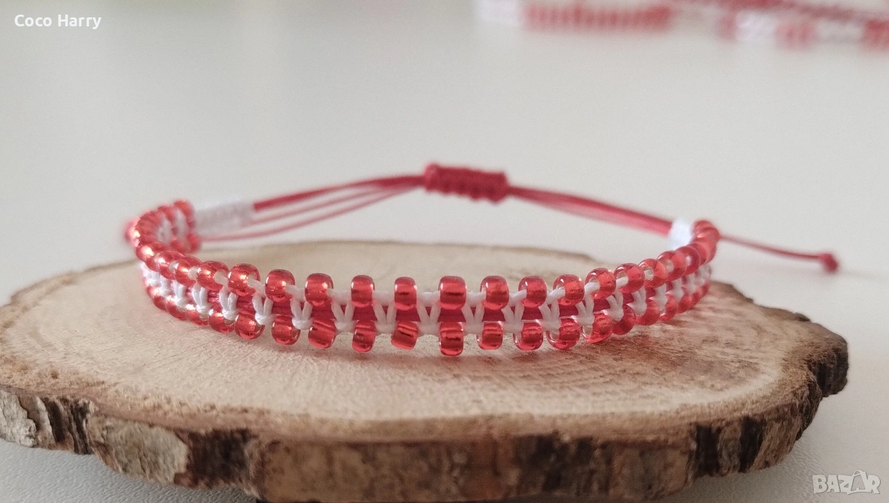 🌺Качествен червен и бял бижутерски шнур 0,8мм,бели и червени стъклени мъниста,регулируема обиколка