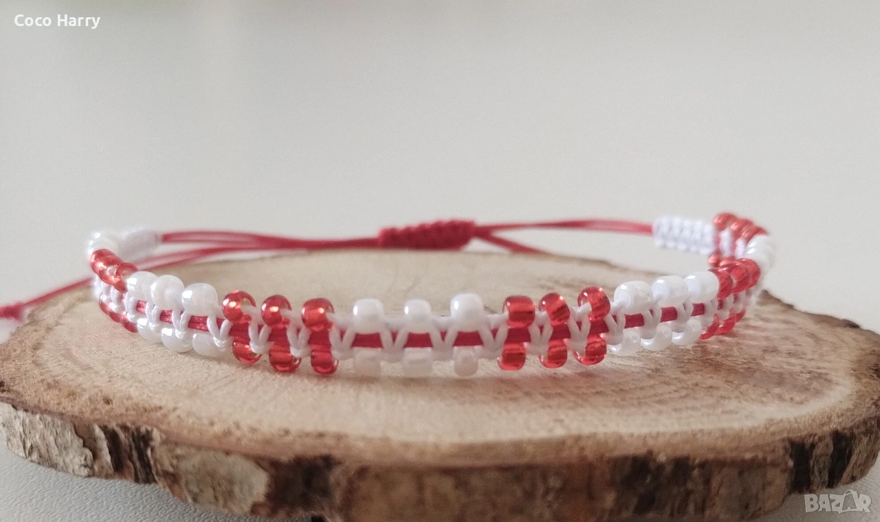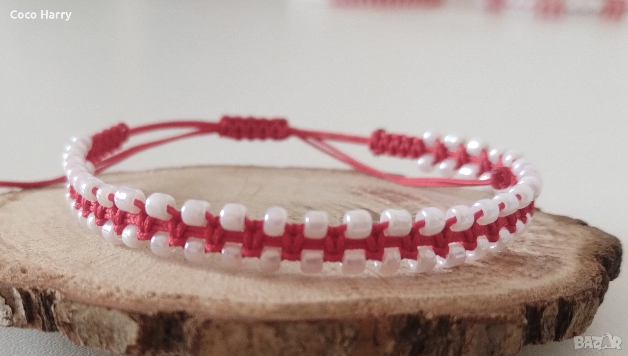 🌺Качествен червен и бял бижутерски шнур 0,8мм,бели и червени стъклени мъниста,регулируема обиколка