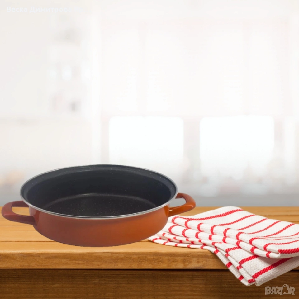 Вариант 1: Диаметър 26 см, височина 7 см, дебелина 0.8 мм.; Вариант 2: Диаметър 30 см, височина 7.2 см, дебелина 0.8 мм.; Вариант 3: Диаметър 32 см, височина 7.7 см, дебелина 0.8 мм.; Материал: Карбонова стомана с емайлирано покритие; Вътрешно покритие: Незалепващо с каменни частици; Съвместимост: Всички видове котлони, включително индукционни, и фурна; Поддръжка: Може да се мие в съдомиялна машина.