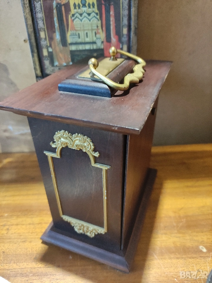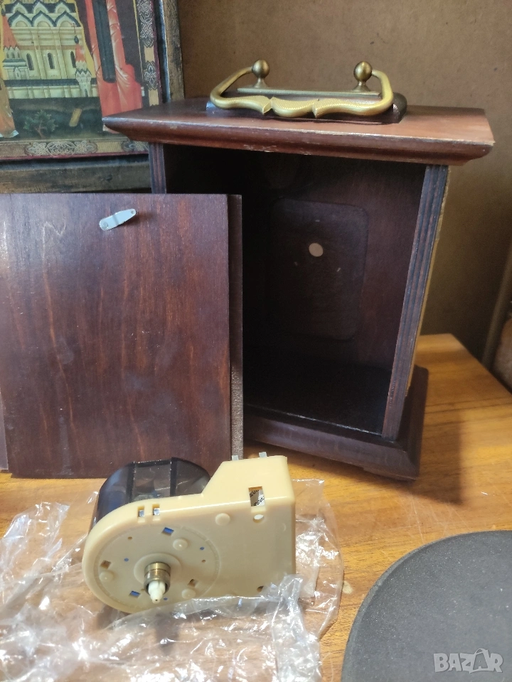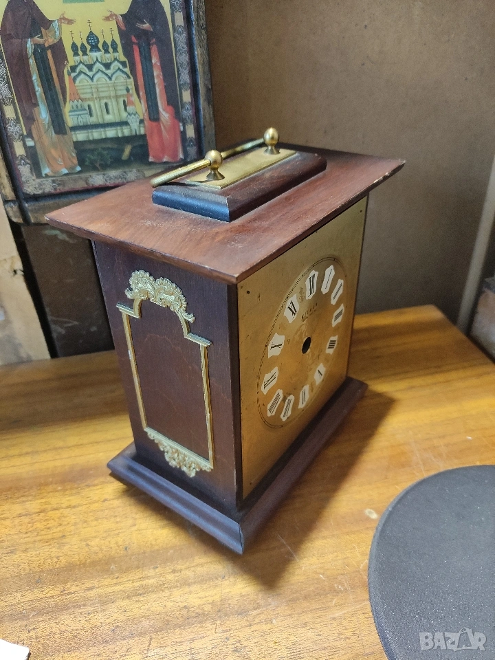 Продавам оригинален настолен часовник Weimar, произведен в ГДР. Часовникът е с масивен дървен корпус, месингови орнаменти и дръжка.