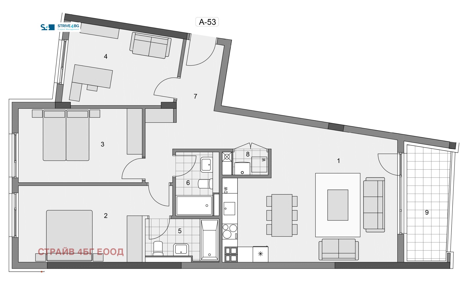 Разпределение: входно антре (12,61 м²), дневна с кухненски бокс и трапезария (31,85 м²), две спални (15,95 м² и 14,11 м²), кабинет (13,06 м²), две бани (4,91 m2 и 4,25 m2), тераса (8,27 м²), килер (1,79 м²)