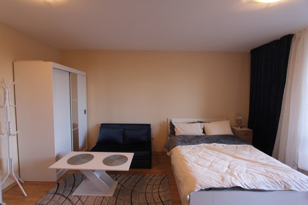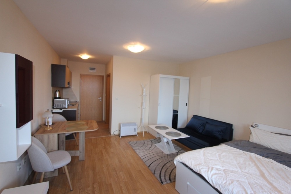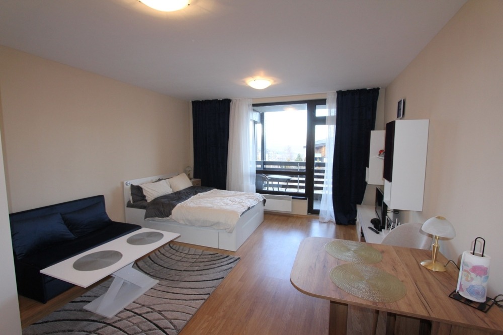 В студиото се влиза през коридор, в който е разположена малка, но оборудвана кухня с котлони, хладилник, микровълнова фурна и абсорбатор. Банята е срещу кухнята и оборудвана с вана и с душ. Има самостоятелен бойлер. Всекидневната е обзаведена с голямо двойно легло, диван с холна масичка, гардероб, разгъваема трапезна маса с два стола и холна секция с телевизор. Студиото има балкон и гледкaна север към Рила планина. Мебелите са нови.
