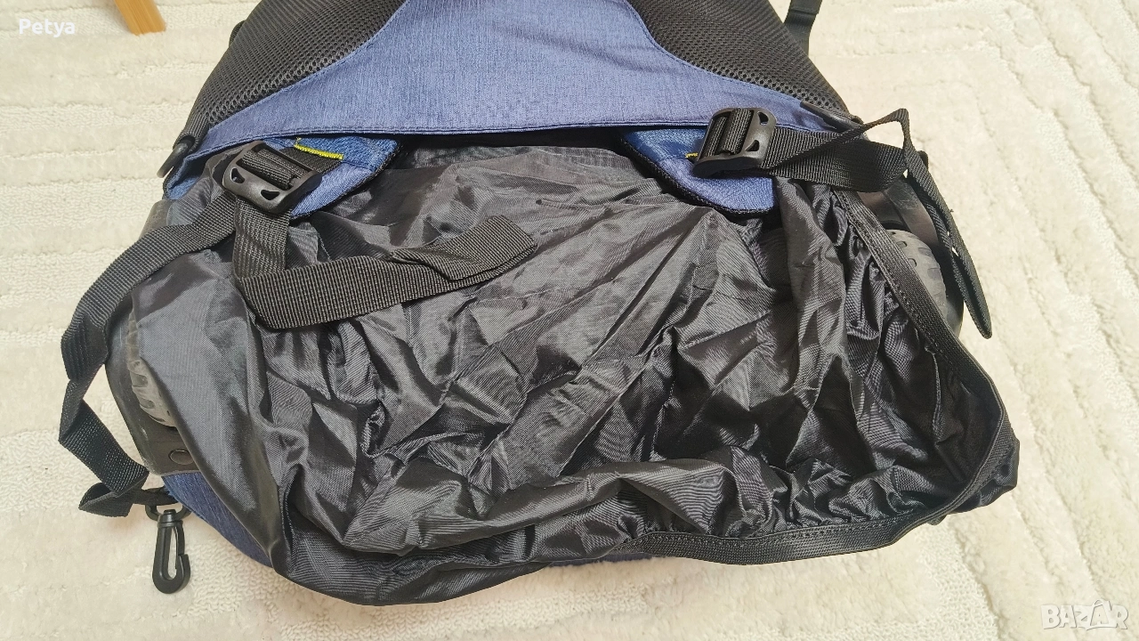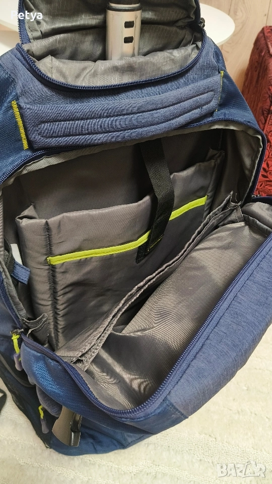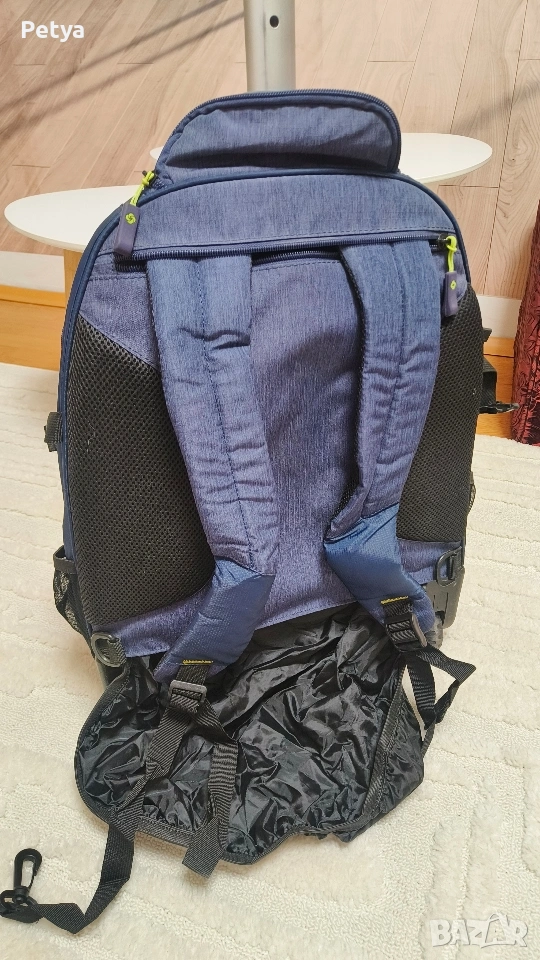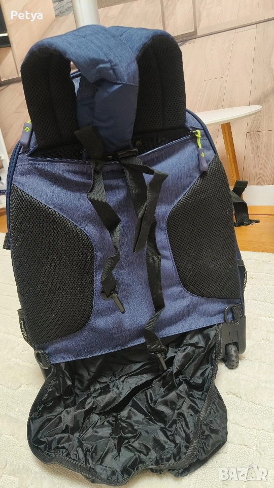 Раница /куфар с колелца,дръжки и дъждобран,като самата тя е водоустойчива.Идеална за служебни пътувания или спортни дейности.Може да се ползва за теглене или носене на гръб.Има преграда,подсилена с дунапрен за компютър и преден джоб за химикалки ,ключове или визитки !